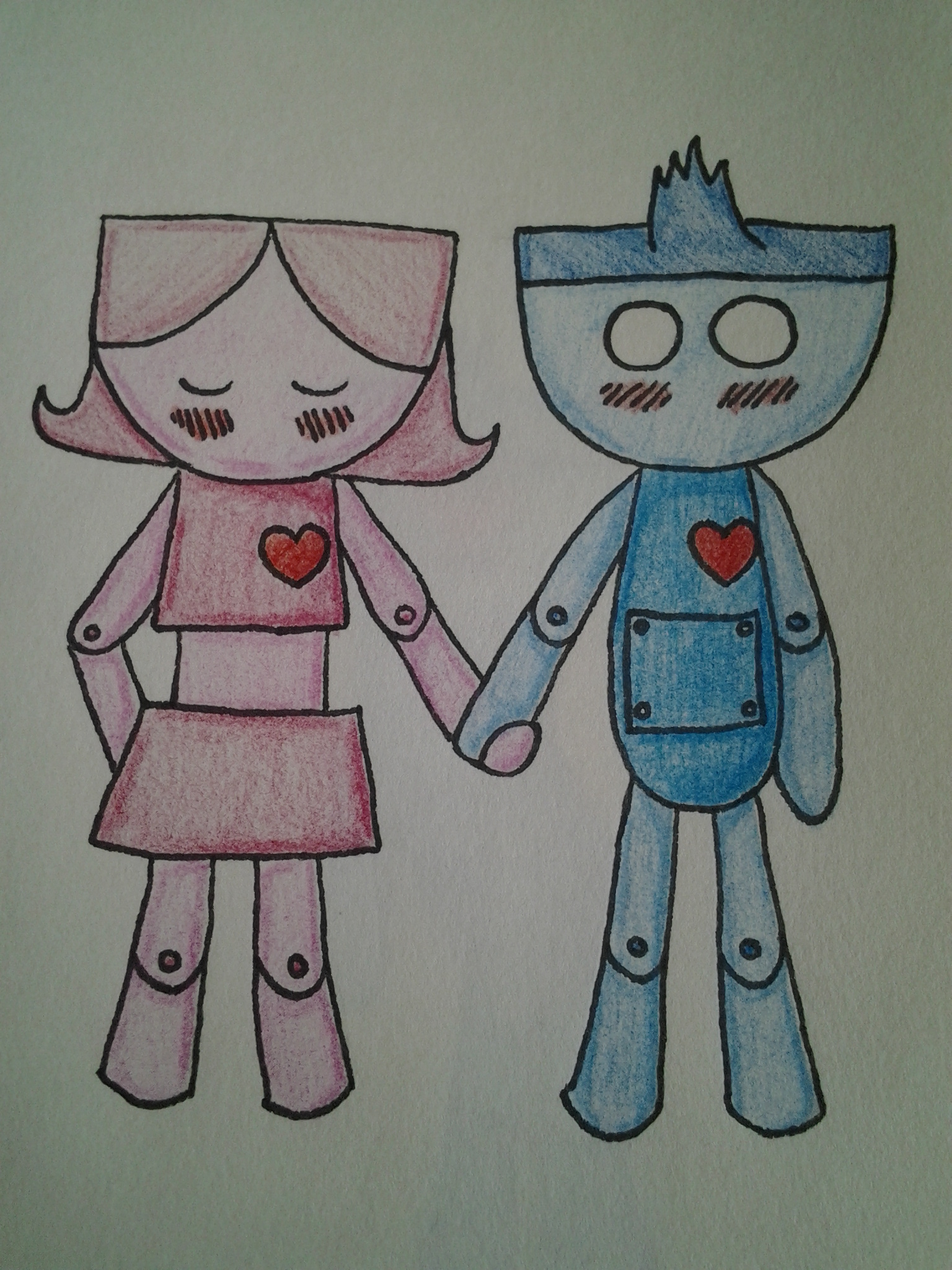 Twee kleine verliefde robots. Allebei heel verlegen en altijd blozend.