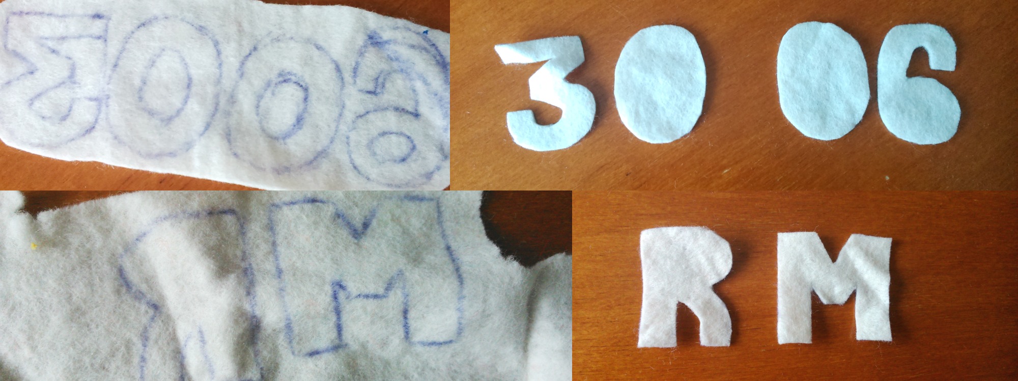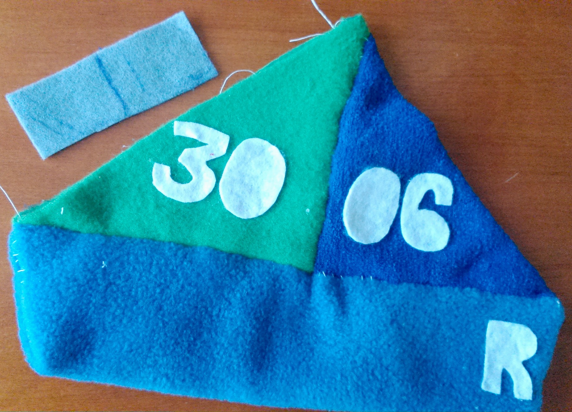 Na het lijmen van de letters en cijfers knippen we het vlaggetje. De vlag moet minstens 4 centimeter lang zijn en tenminste 10 centimeter breed. Wanneer je denkt dat het vlaggetje te massaal wordt, kan je er altijd nog een stuk afknippen. Naai ook deze binnenstebuiten met de festonsteek. Met behulp van je pen kun je het vlaggetje weer terug vouwen. Vul vervolgens je vlag op met watten.