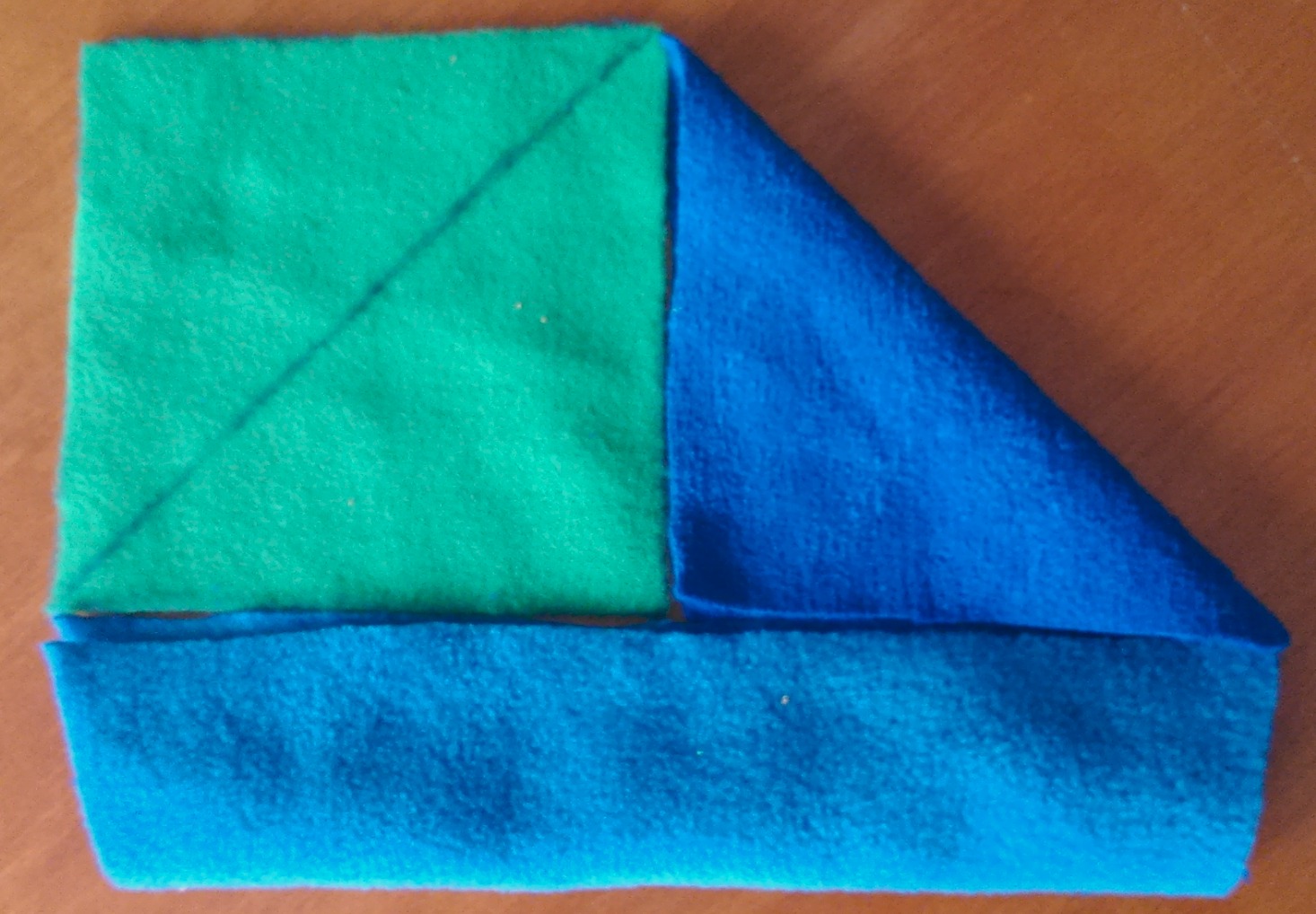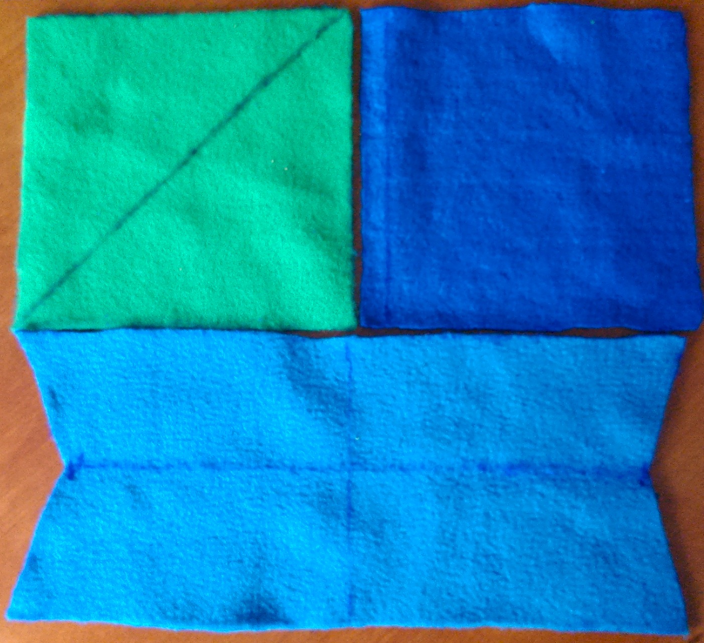 Teken in één van de twee vierkanten een diagonale lijn en knip langs deze lijn de stof in tweeën.