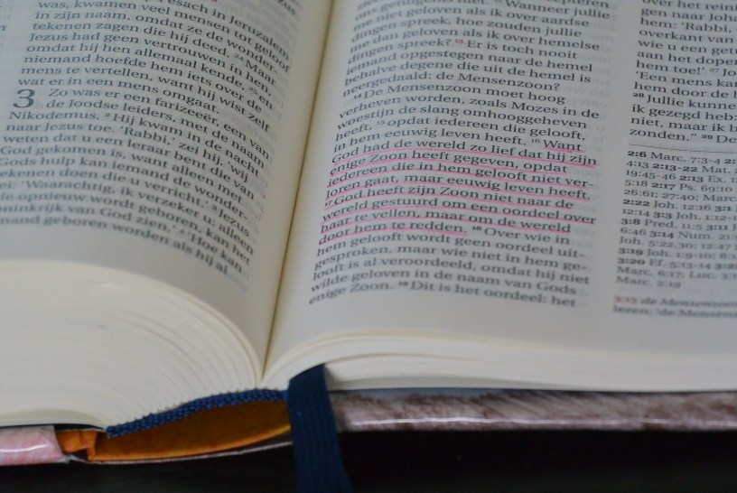 Omdat ik sinds juni in bezit ben van een bijbelapp op mijn mobiel, ben ik eigenlijk steeds meer gaan zoeken naar mooie Bijbelverzen. Ik heb ze zelfs in mijn Bijbel gemarkeerd en vond het zonde ze om niet te delen. Daarom heb ik besloten om elke week een van mijn favoriete Bijbelverzen te posten.Want God had de wereld zo lief dat hij zijn enige Zoon heeft gegeven, opdat iedereen die in hem gelooft niet verloren gaat, maar eeuwig leven heeft. – Johannes 3:16