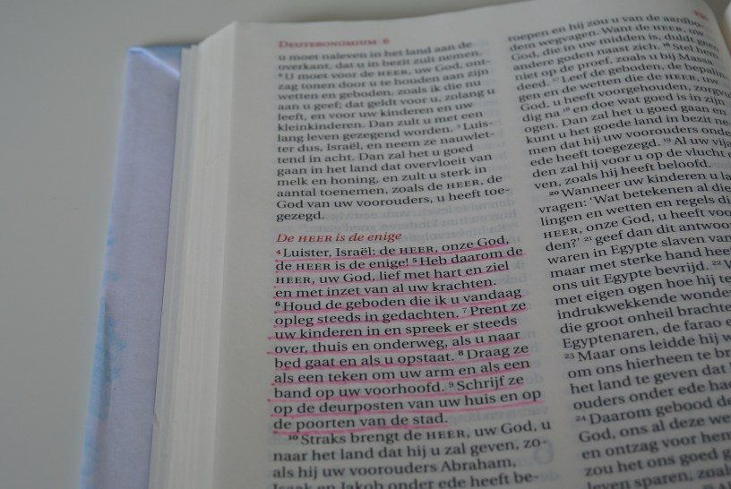 Luister, Israël: de Heer, onze God, de Heer is de enige! Heb daarom de Heer, uw God, lief met hart en ziel en met inzet van al uw krachten. Houd de geboden die ik u vandaag opleg steeds in gedachten. Prent ze uw kinderen in en spreek er steeds over, thuis en onderweg, als u naar bed gaat en als u opstaat. Draag ze als een teken om uw arm en als een band op uw voorhoofd. Schrijf ze op de deurposten van uw huis en op de poorten van de stad. – Deuteronomium 6:4-9