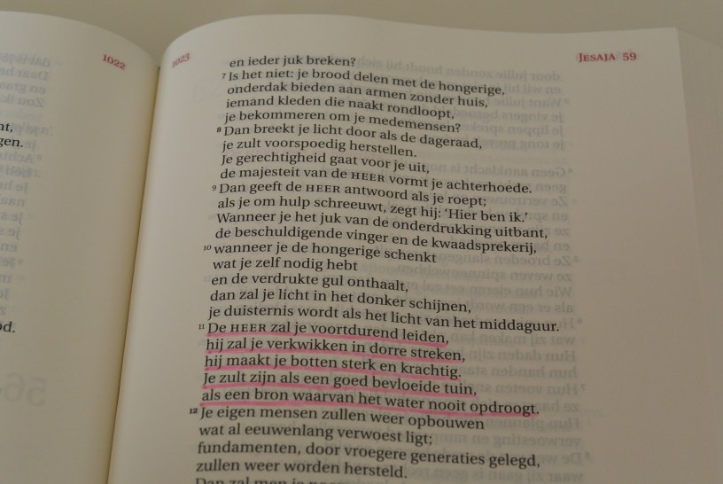 De HEER zal je voortdurend leiden,hij zal je verkwikken in dorre streken,hij maakt je botten sterk en krachtig.Je zult zijn als een goed bevloeide tuin,als een bron waarvan het water nooit opdroogt. – Jesaja 58:11