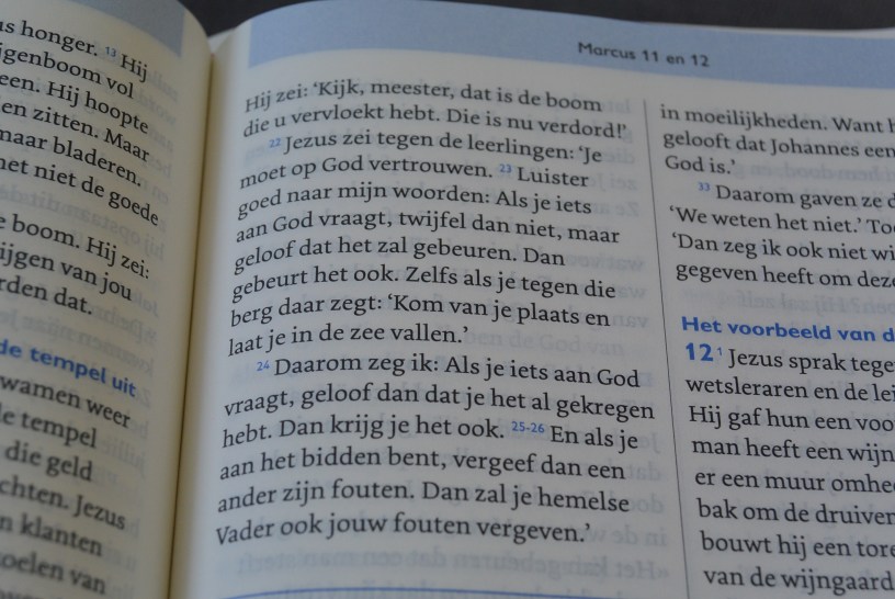 Jezus vertelt Zijn leerlingen over vertrouwen. “Wanneer je bidt, vertrouw er dan op dat God je al hebt gegeven waar je om vraagt.” Hij weet immers al je gedachten en verlangens. God zorgt voor je, en zal nooit stoppen met voor je te zorgen. En als je bidt, vergeef de ander. Dan wordt jij ook vergeven.