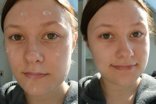 De crème is niet heel dik, maar ook niet heel waterig. Hij smeert fijn uit. Op de foto is dit niet heel goed te zien, maar er zit een groenig kleurtje aan. Hier zie je na het uitsmeren niks meer van. De crème heeft een frisse, subtiele geur.