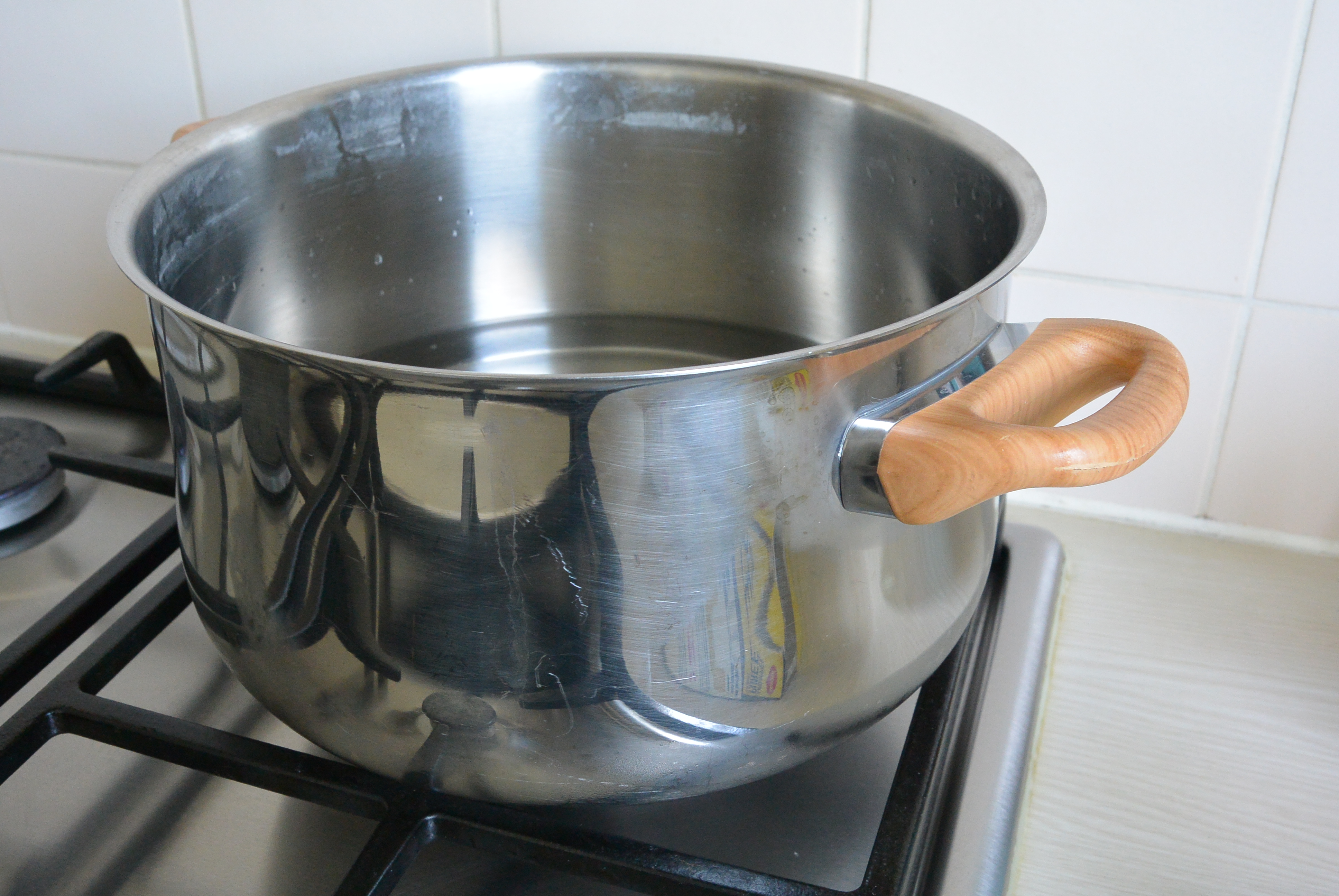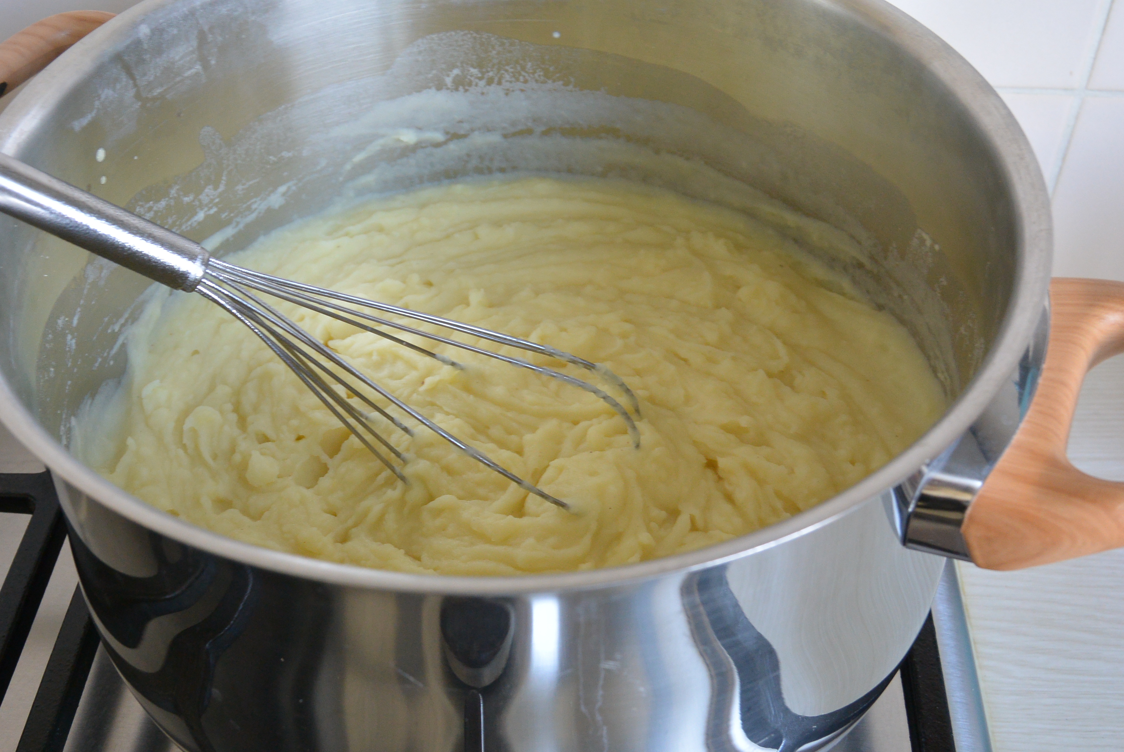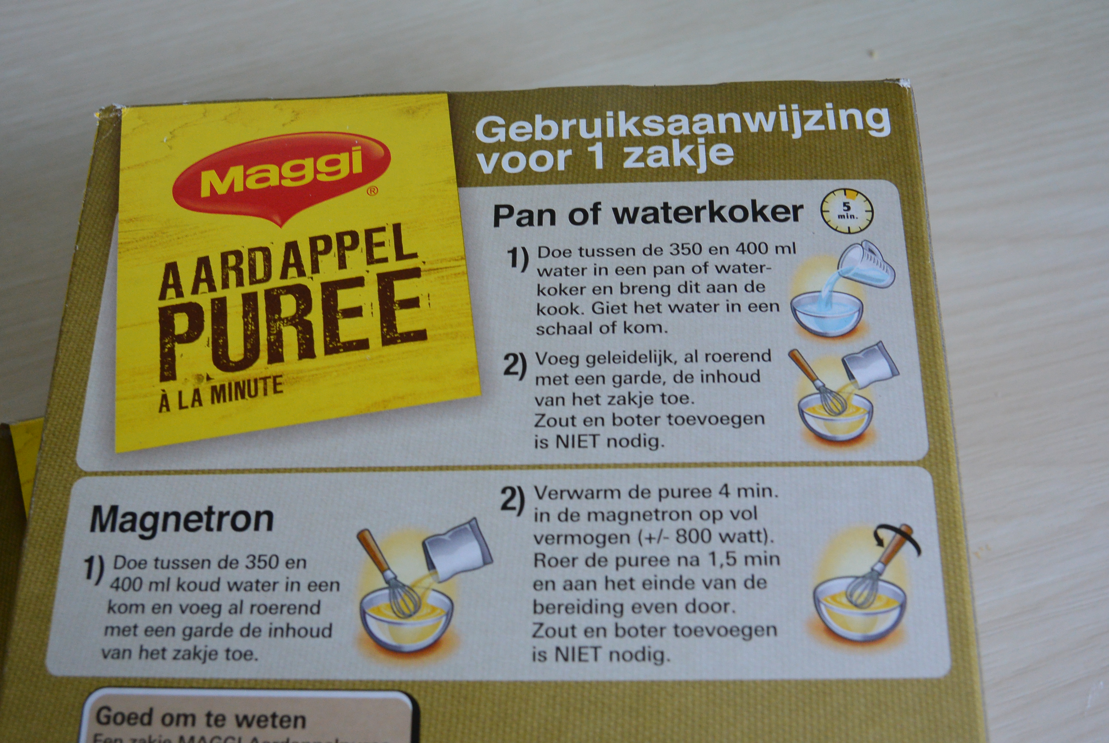 DSC_3164 DSC_3165Pak vervolgens een grote pan en vul deze met de juiste hoeveelheid water als op het pak van de aardappelpuree staat. Hiervoor heb ik drie zakjes aardappelpuree gebruikt (anderhalf pak dus). Zet de pan op de pit en laat het rusten tot het aan de kook is.