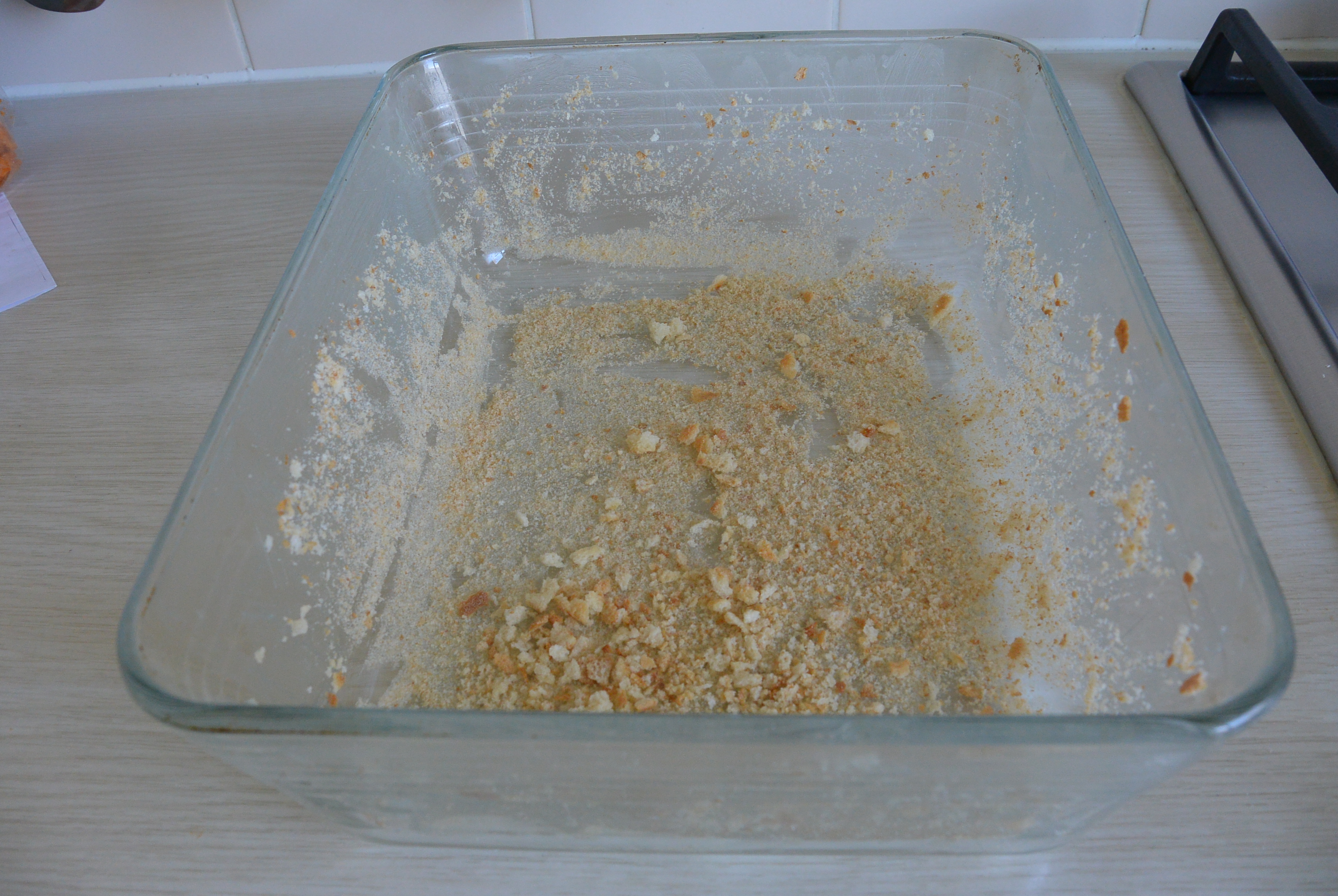 DSC_3166Vet de ovenschaal in met wat bakboter. Verkruimel vervolgens een beschuitje en strooi deze over de bodem. Zorg ervoor dat ook de zijkanten bedekt zijn met boter en beschuit. Dit voorkomt het aankoeken.