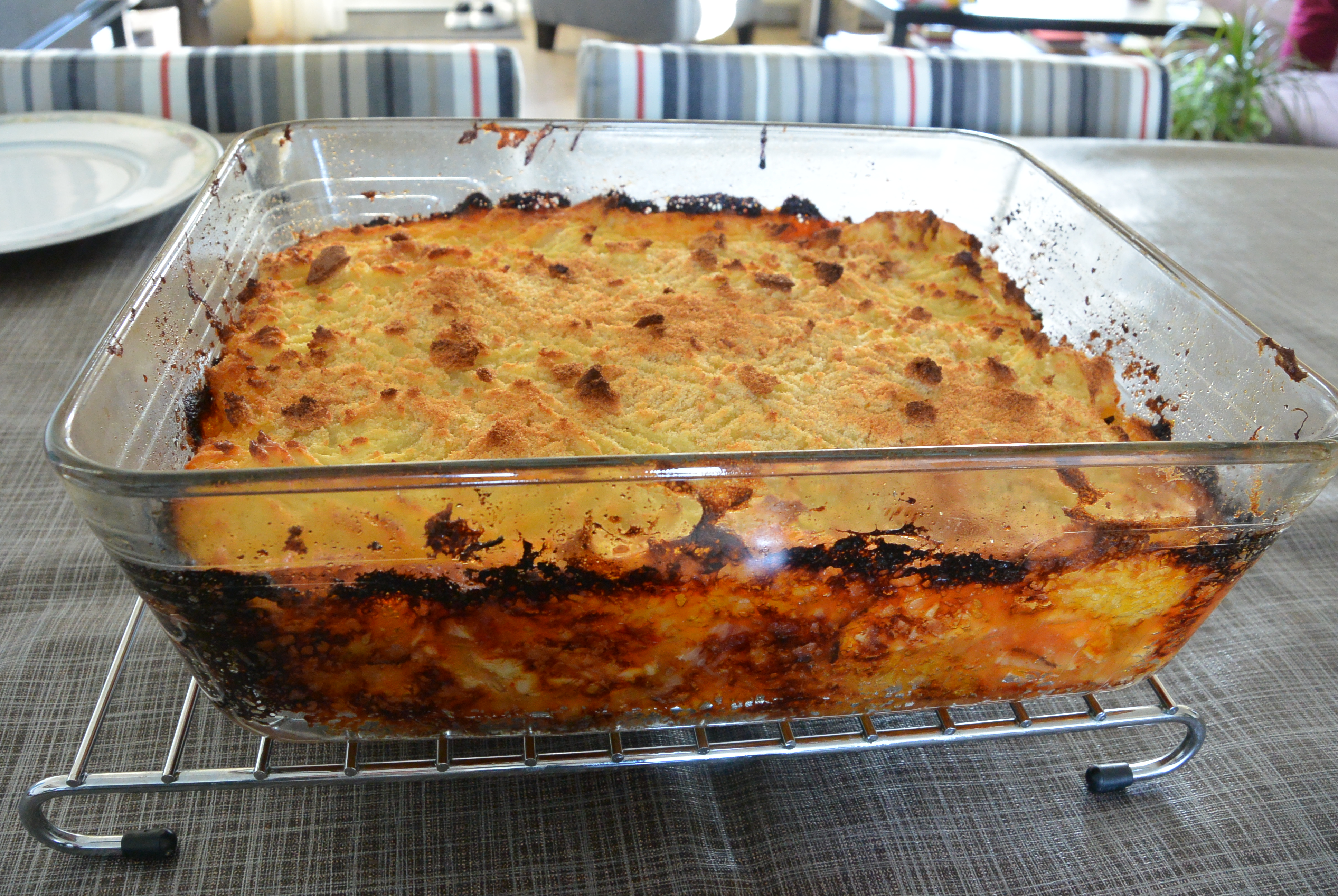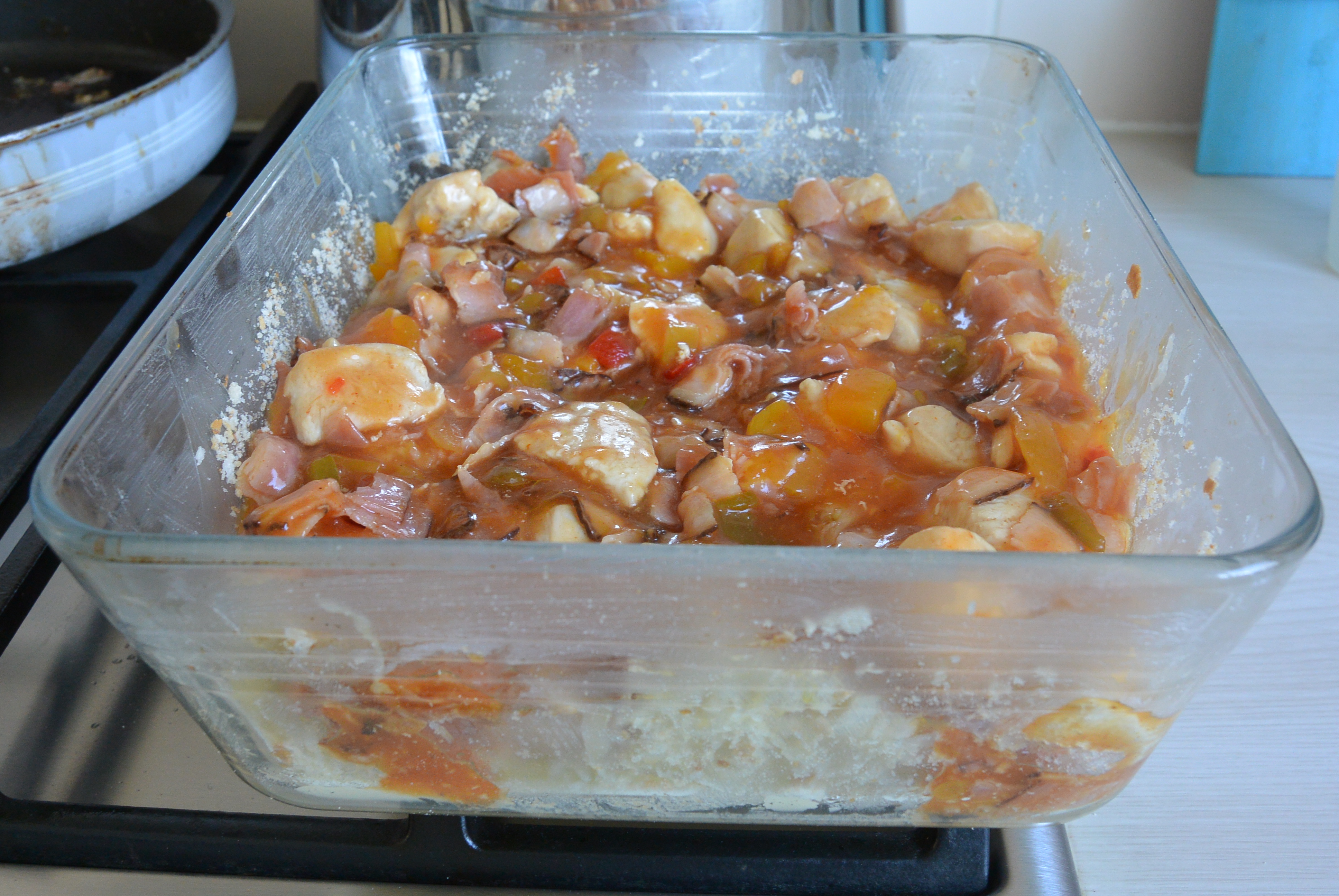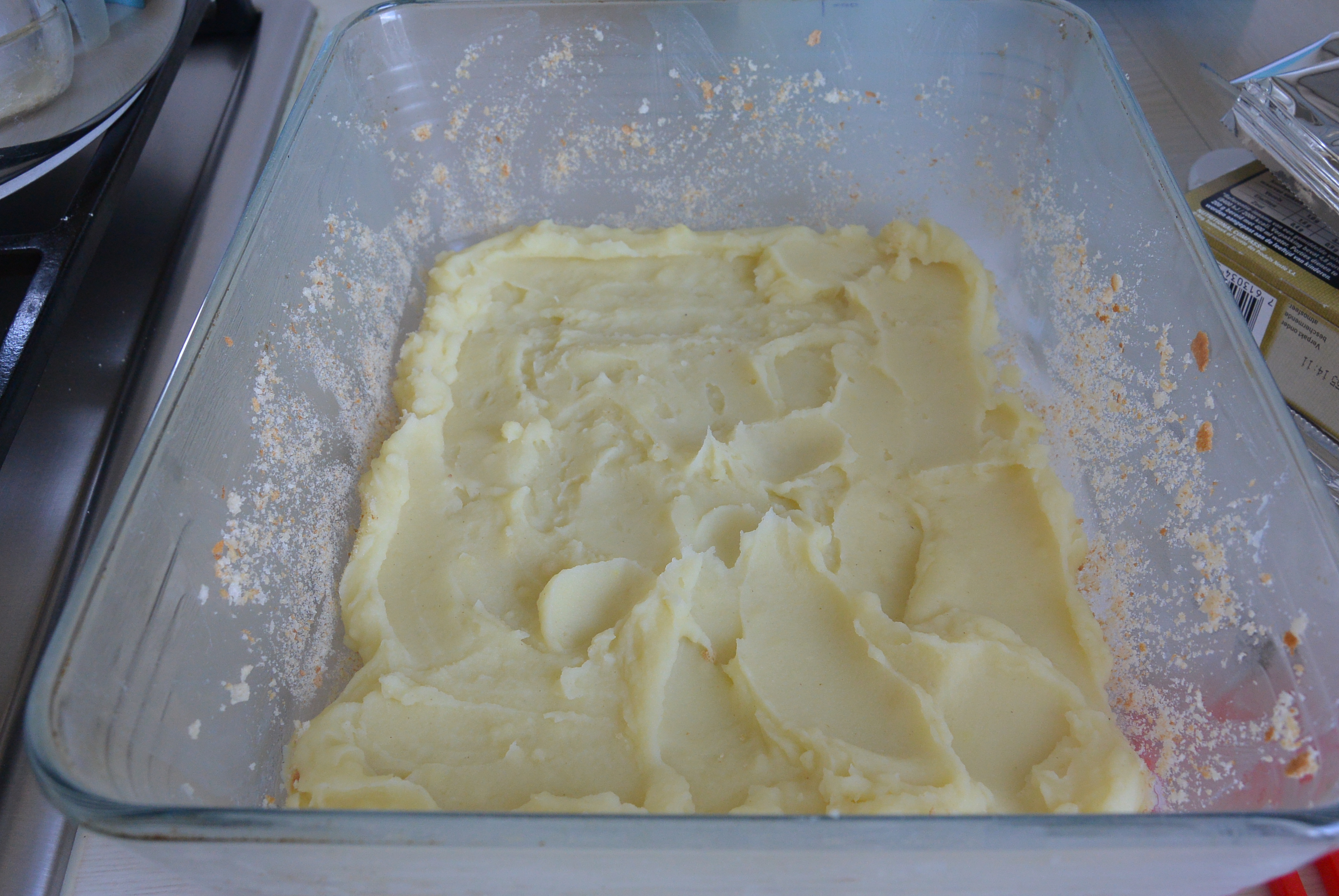 DSC_3174DSC_3176Doe de kip in een pan en laat deze op een laag pitje bakken terwijl je de helft van de aardappelpuree in de ovenschaal schept. Maak de laag aardappelpuree zo vlak mogelijk. Verdeel het goed over de bodem.