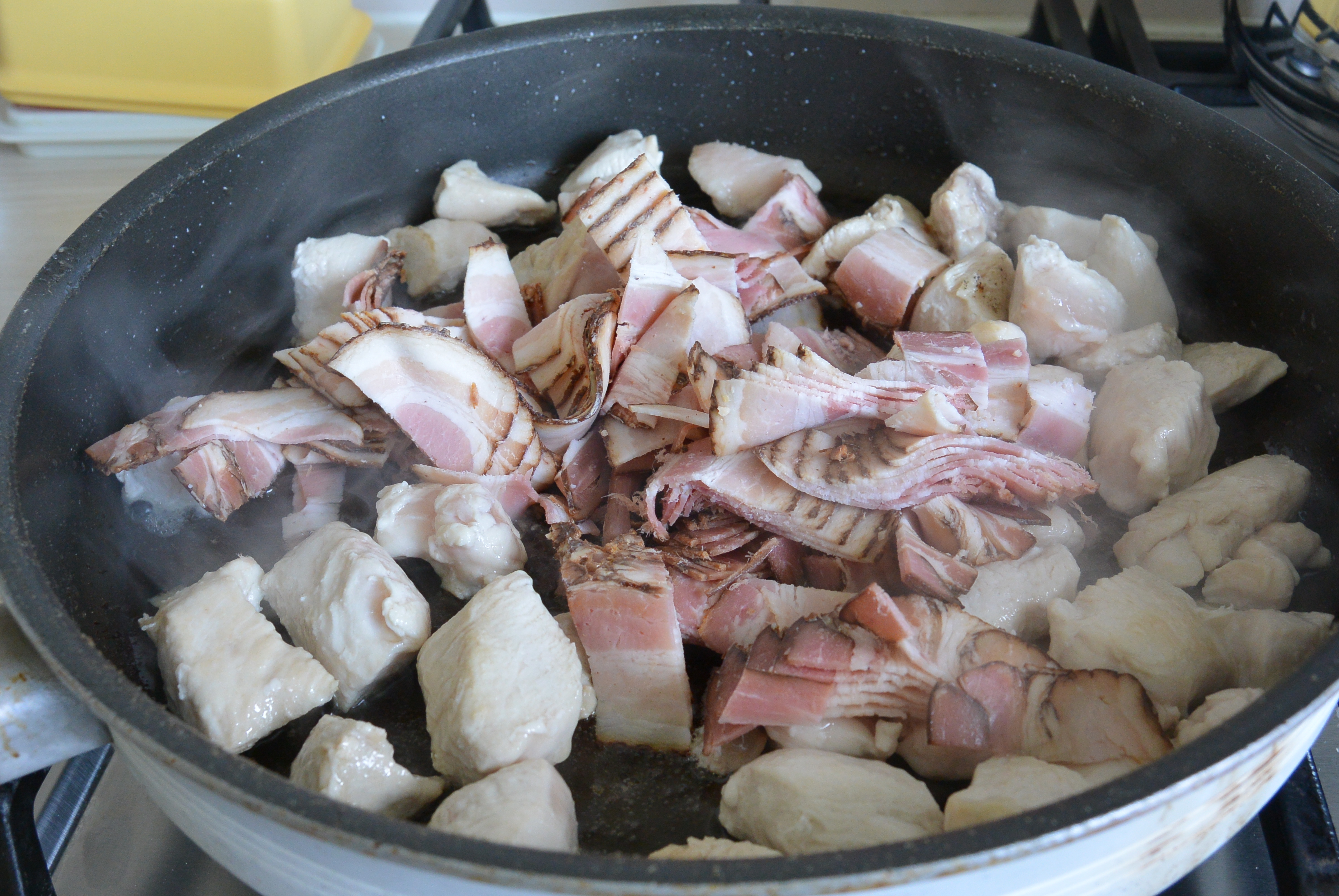 DSC_3177DSC_3178Snijd de katenspek in kleine stukjes nadat je de pit van de kip weer iets hoger hebt gezet. Voeg het vervolgens toe aan de kip en laat het meebakken. Roer af en toe even om. De kip moet er lichtbruin uitzien.