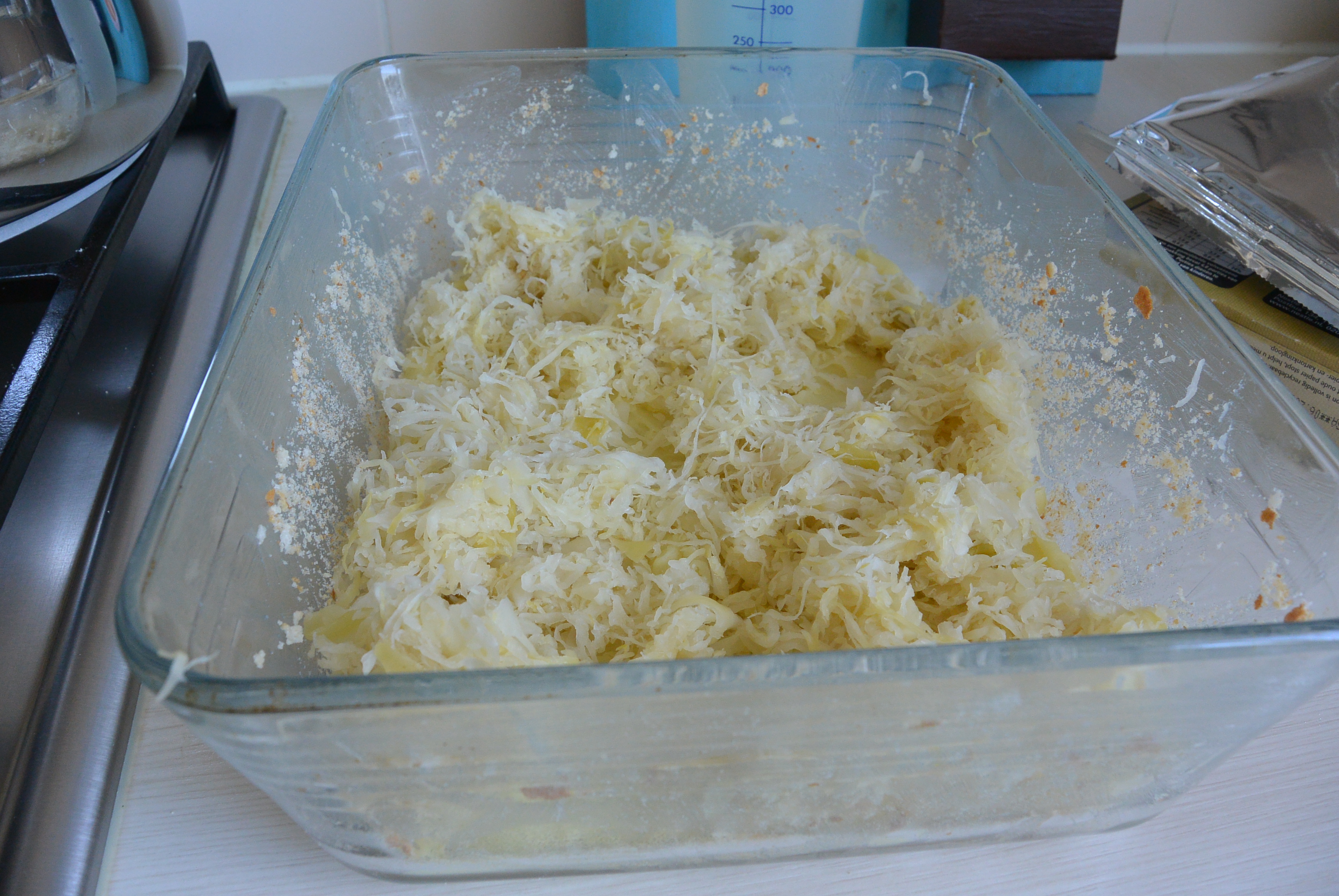 DSC_3181Pak de zuurkool en knijp het meeste vocht eruit boven een vergiet. Strijk het vervolgens uit over de laag aardappelpuree in de ovenschaal.