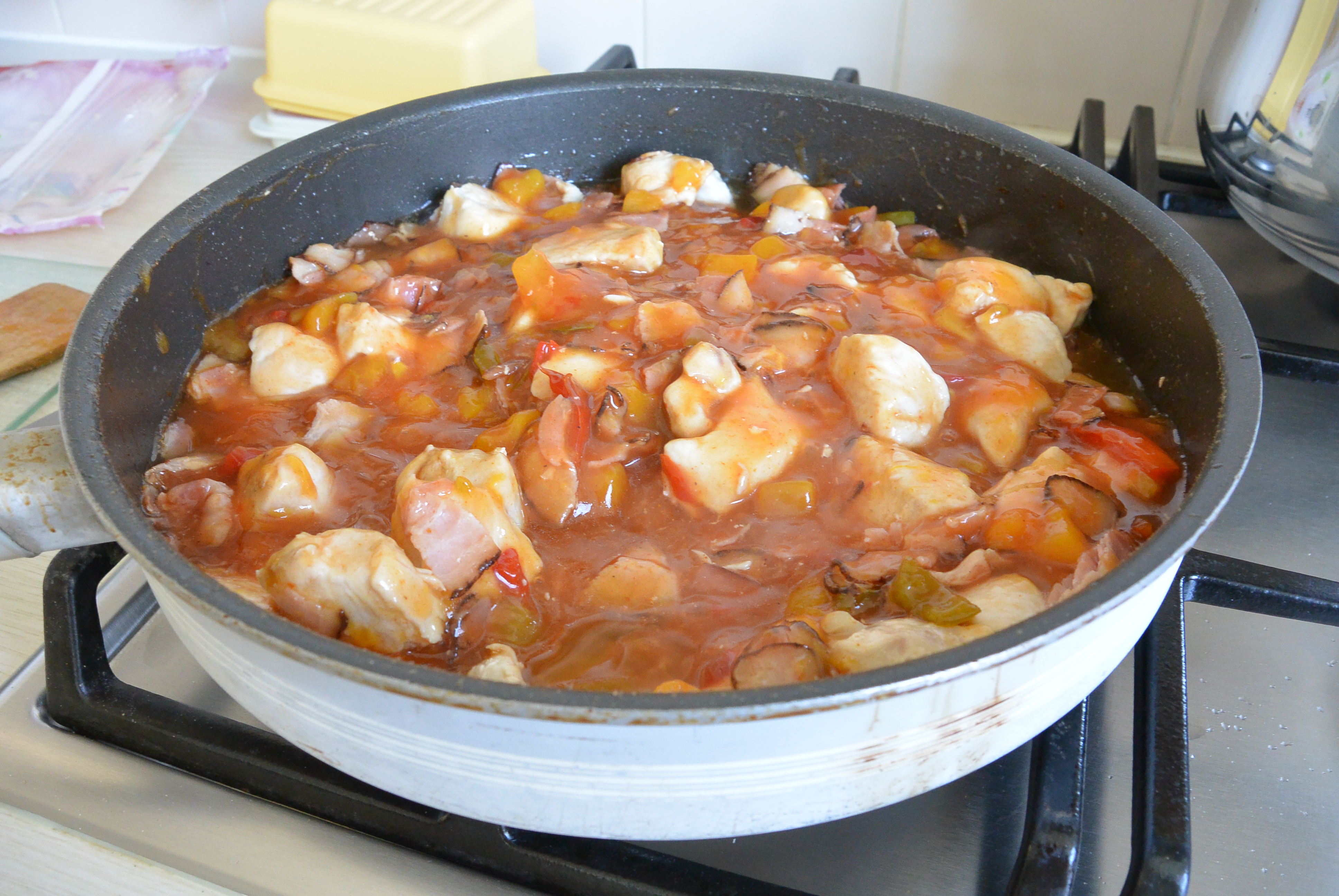 DSC_3183DSC_3185Giet de Chicken Tonight saus in de pan met kip en katenspek en roer alles goed door. Laat het nog een halve minuut sudderen. DSC_3189Giet de saus, kip en katenspek-mix over de laag zuurkool heen. Spreid het goed uit.