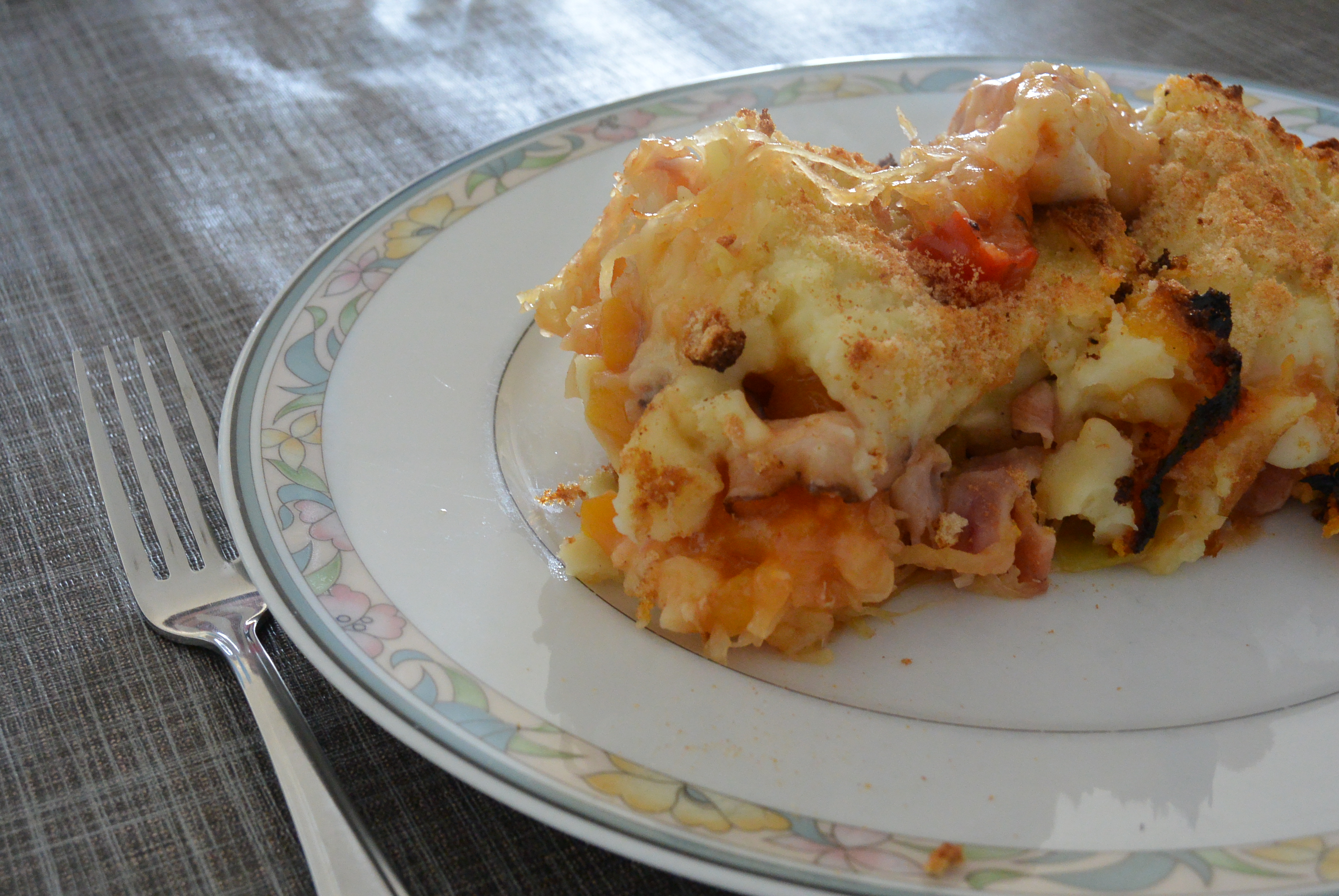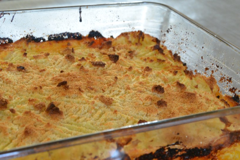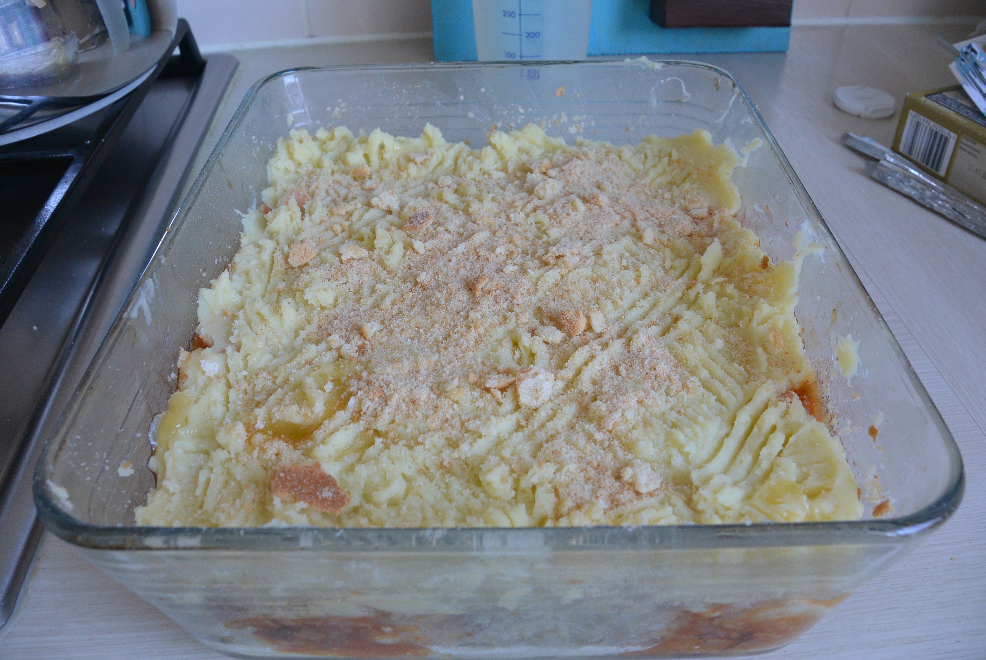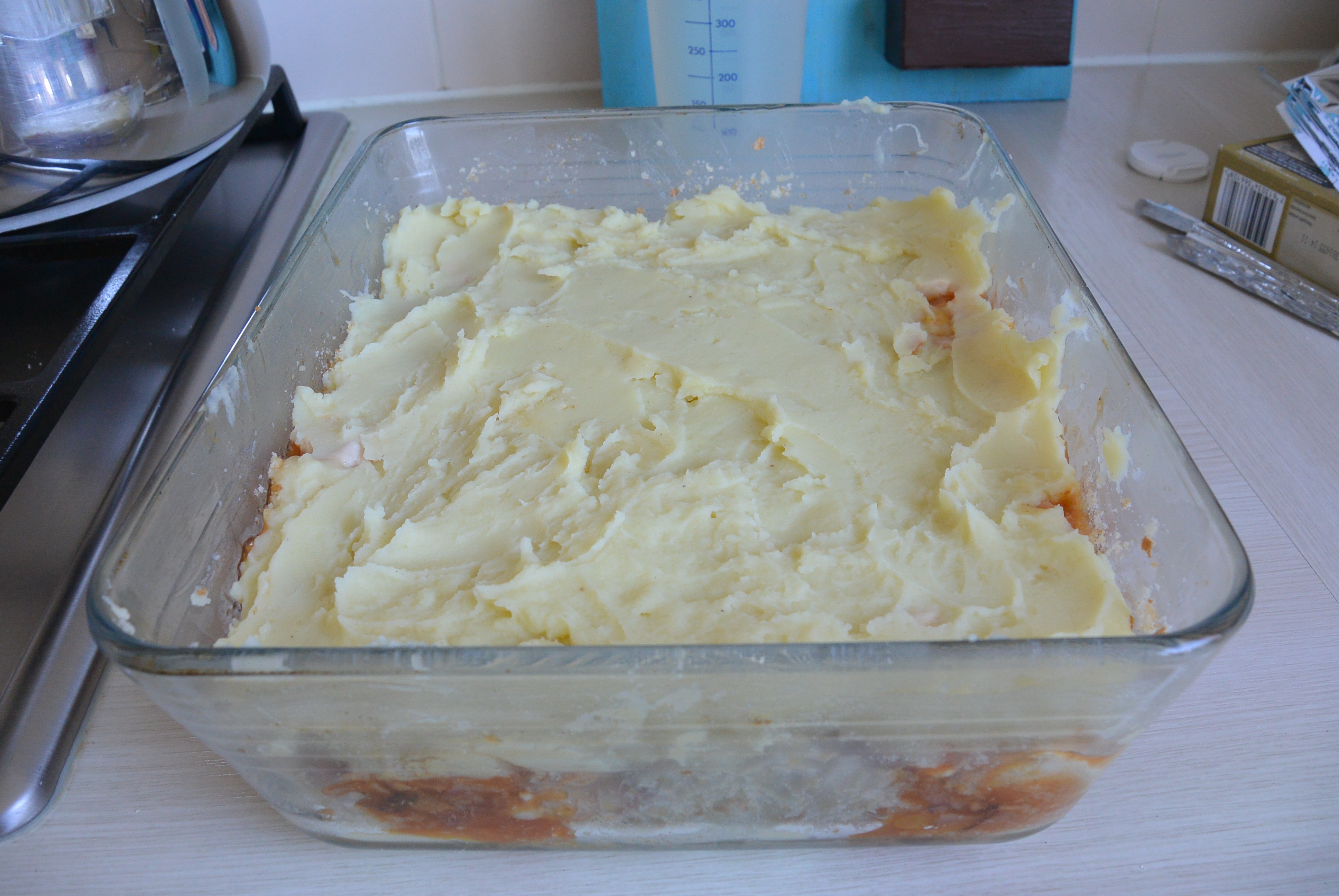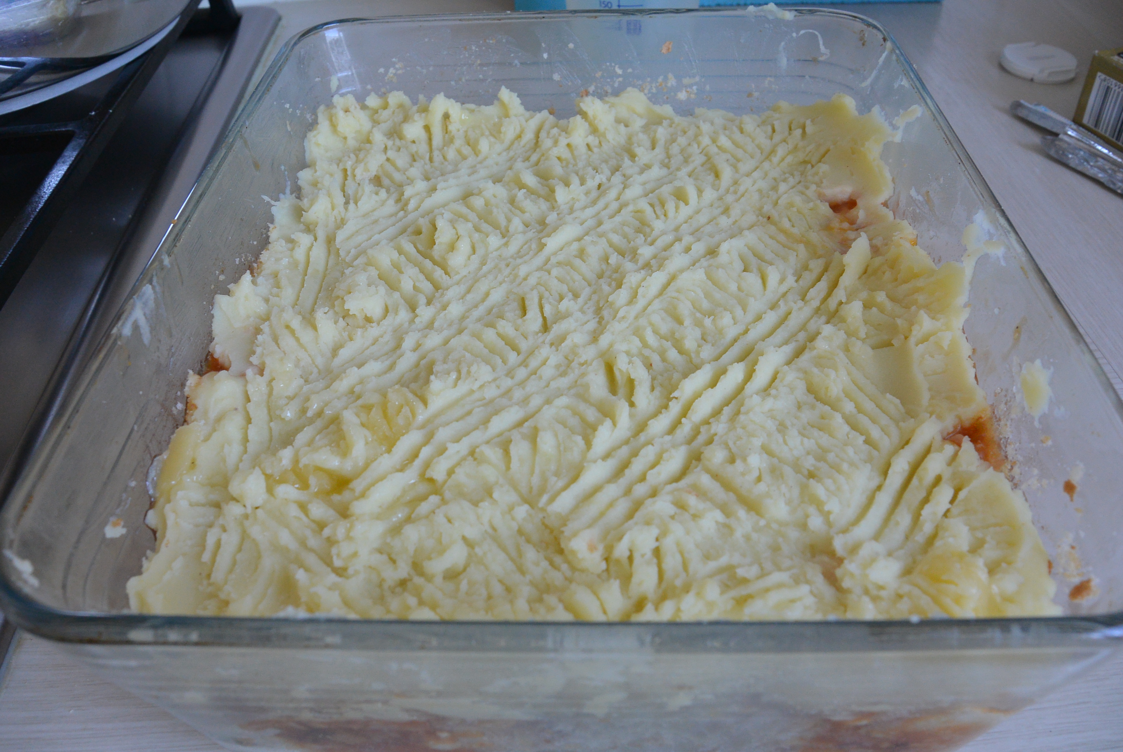 DSC_3191Verspreid de laatste helft aardappelpuree hierover heen. Smeer het uit.
