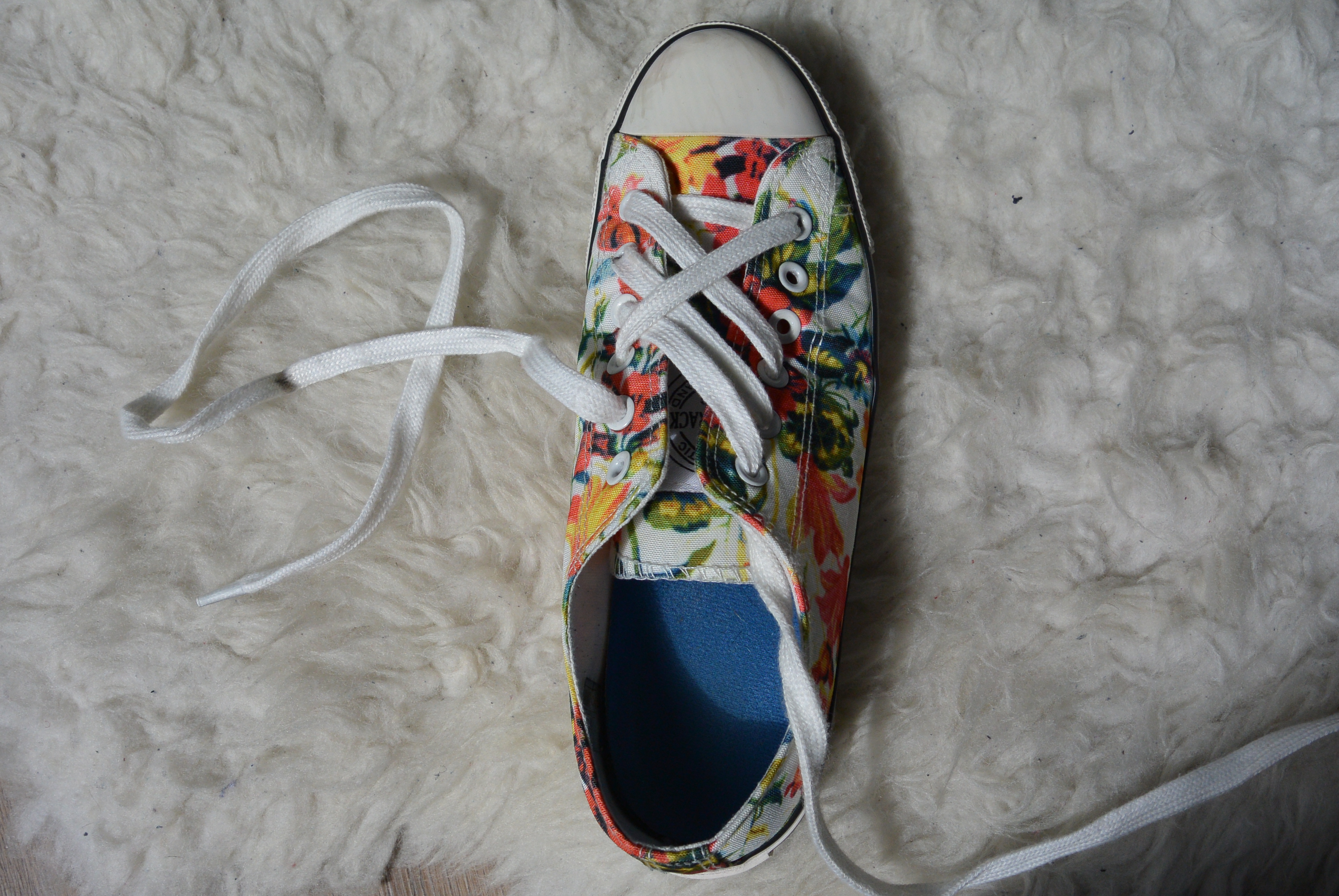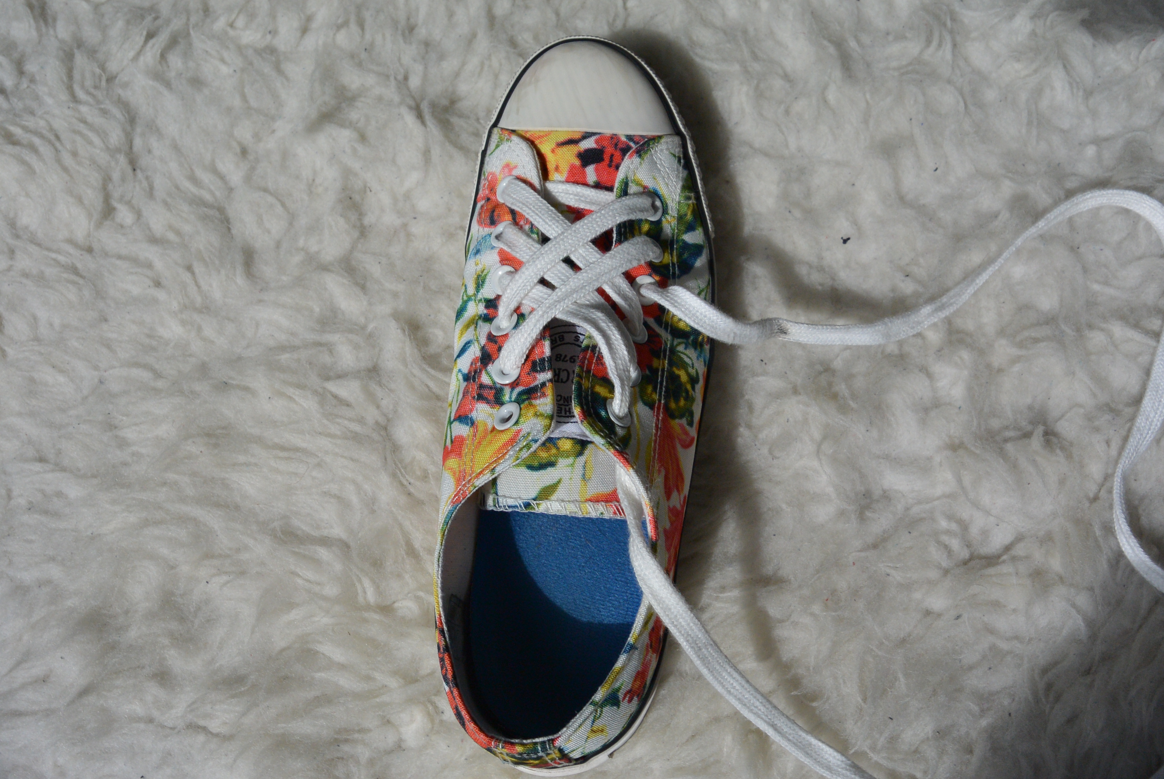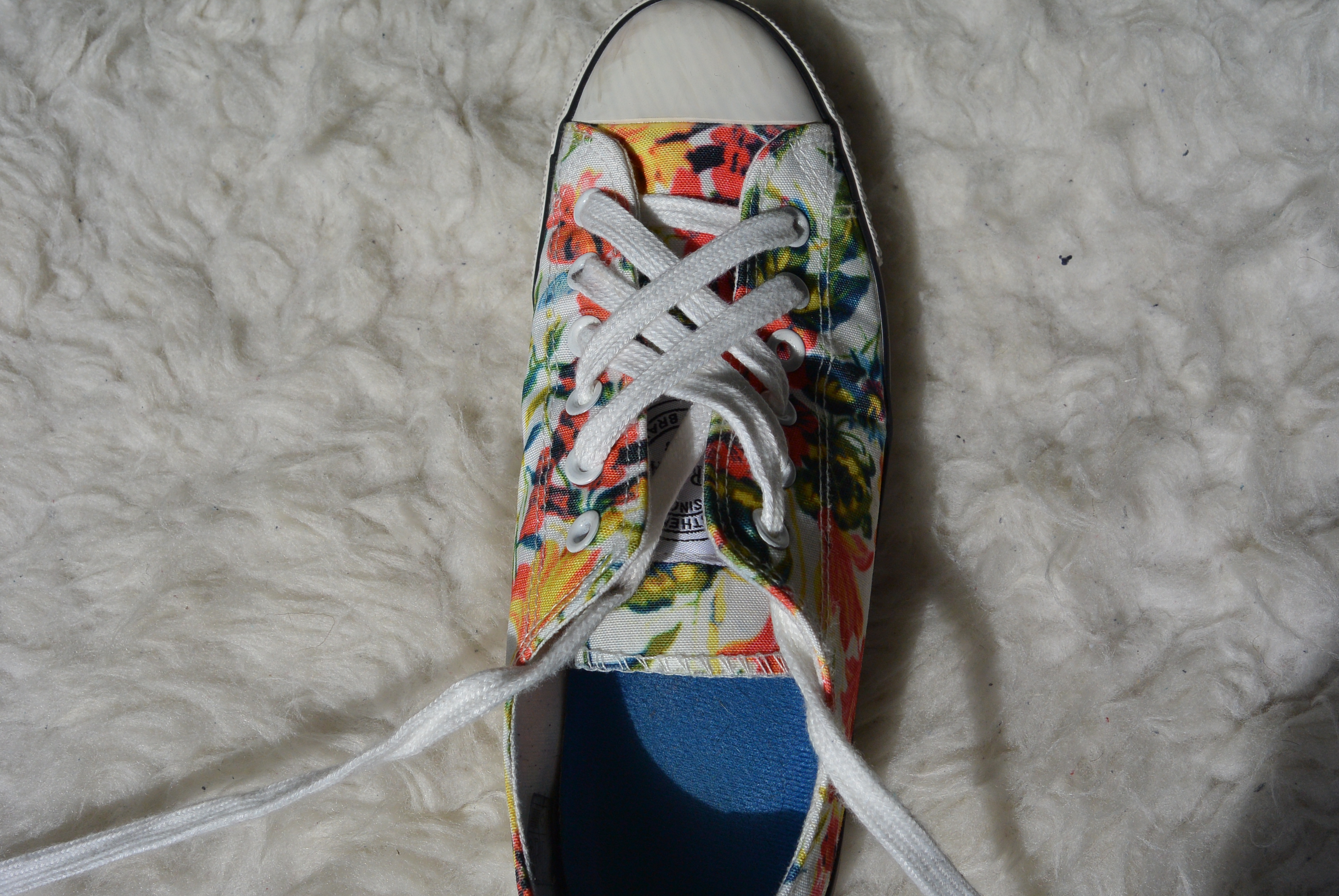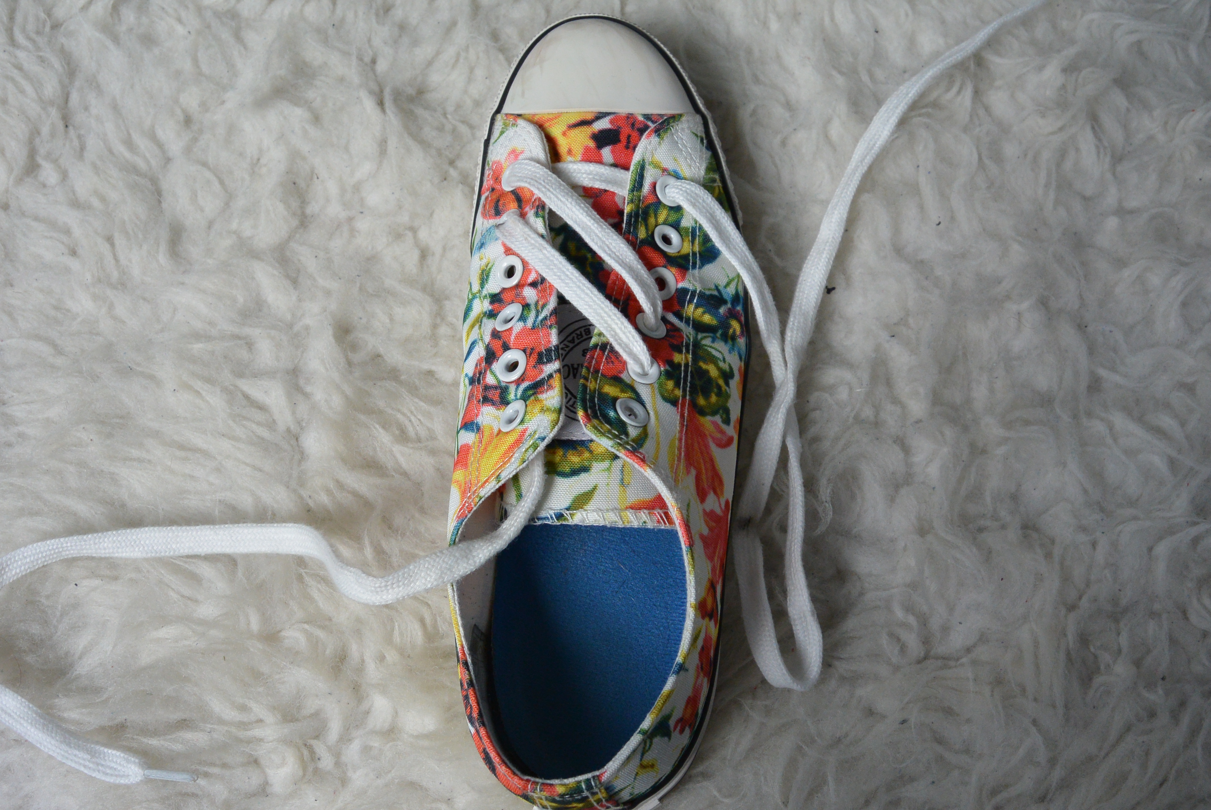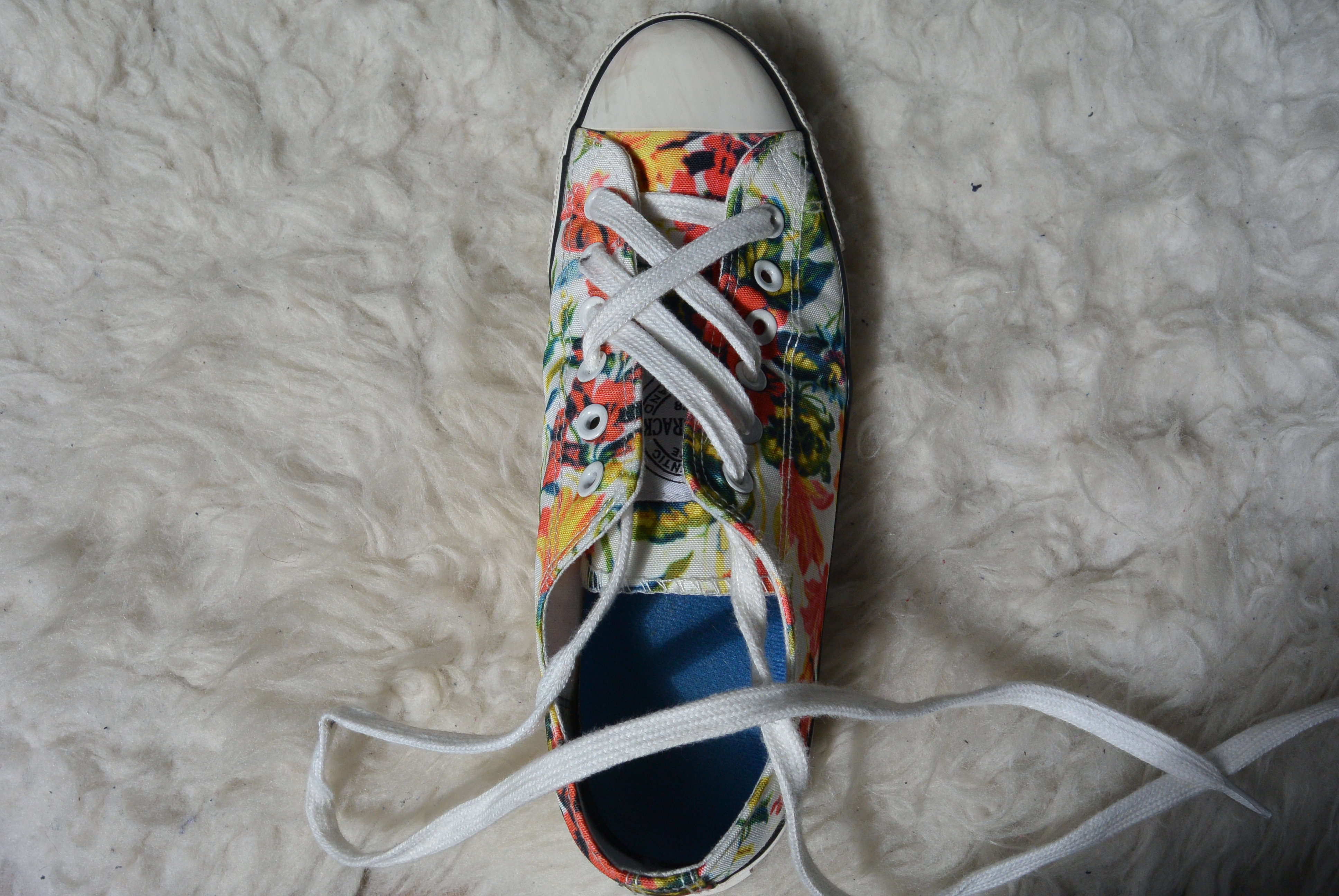 Stap 11: Doe de veter diagonaal en over het andere rijgwerk heen door het laatste oogje, en klaar! Je kunt je veters nu strikken en gaan! De instructies voor de linkerschoen werken precies omgekeerd. Hier begin je aan het rechter stuk veter en rijg je daarna het linker stuk.