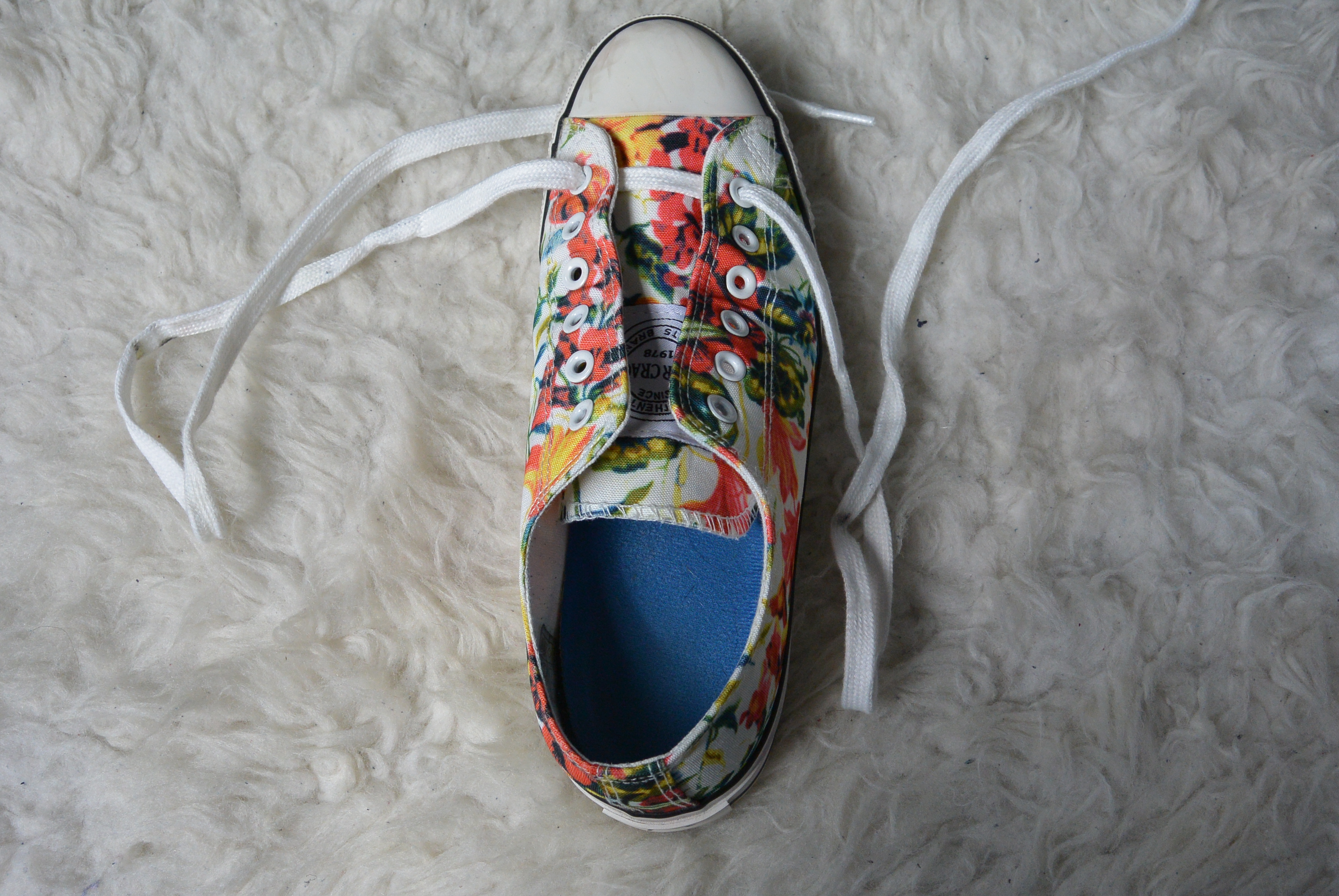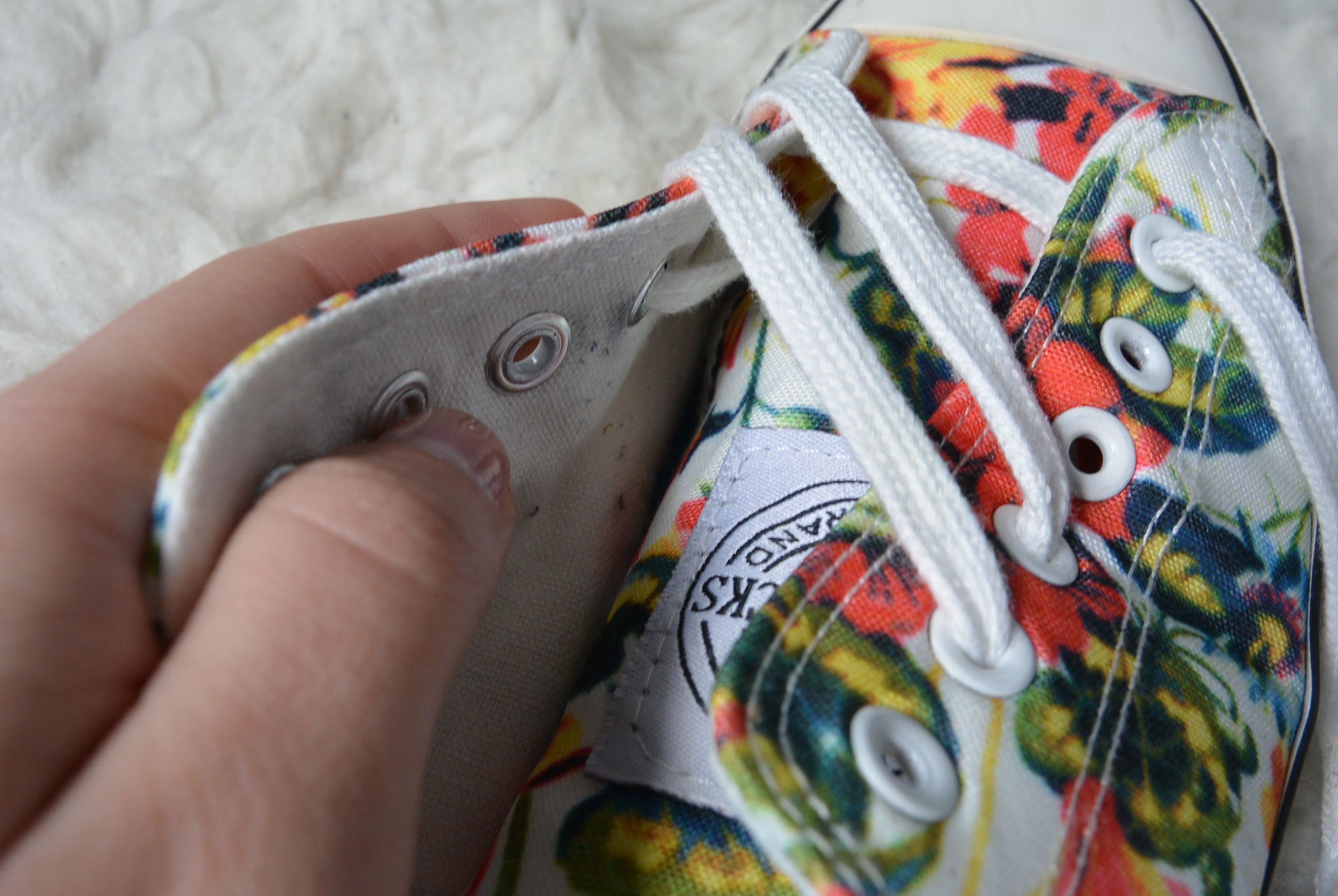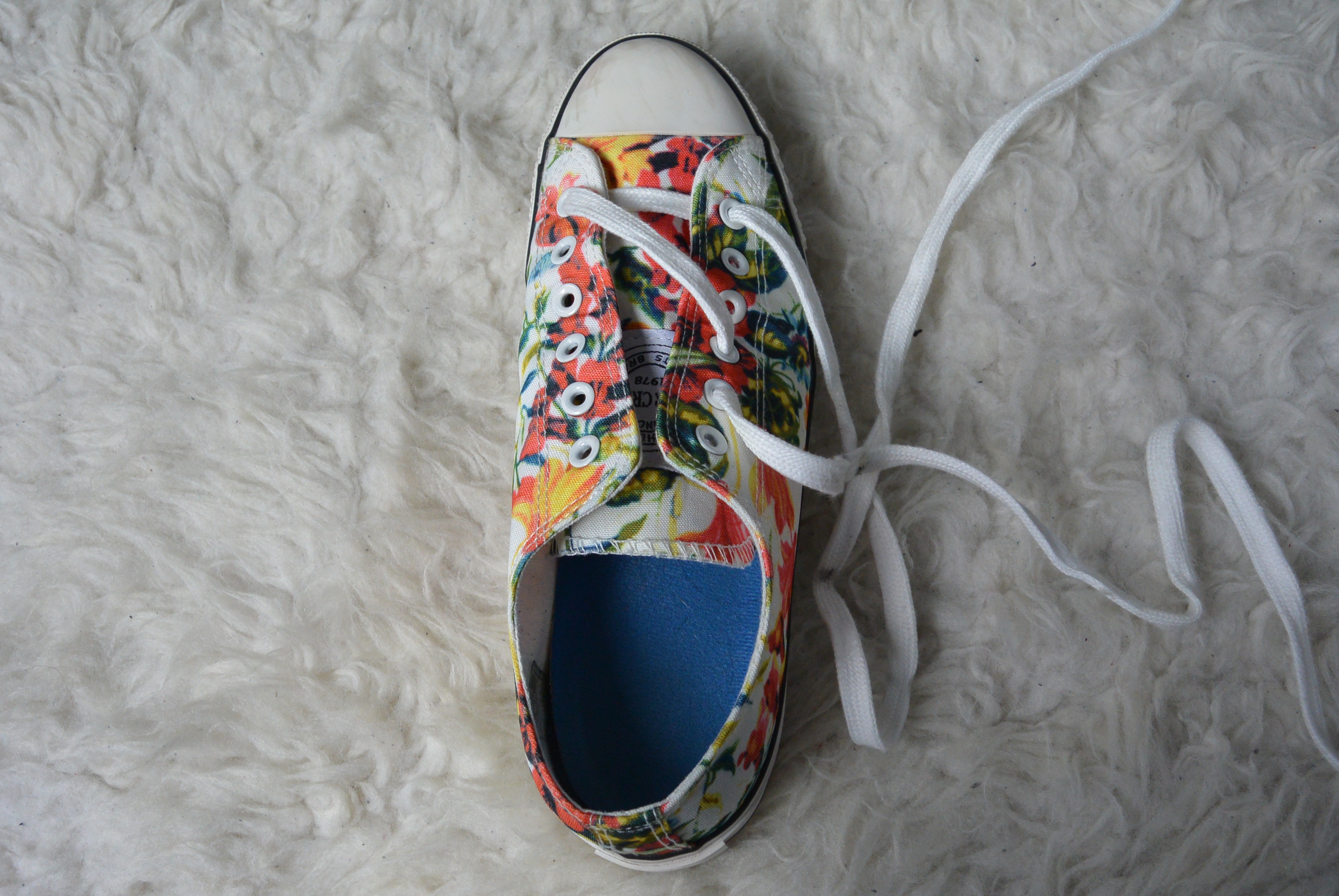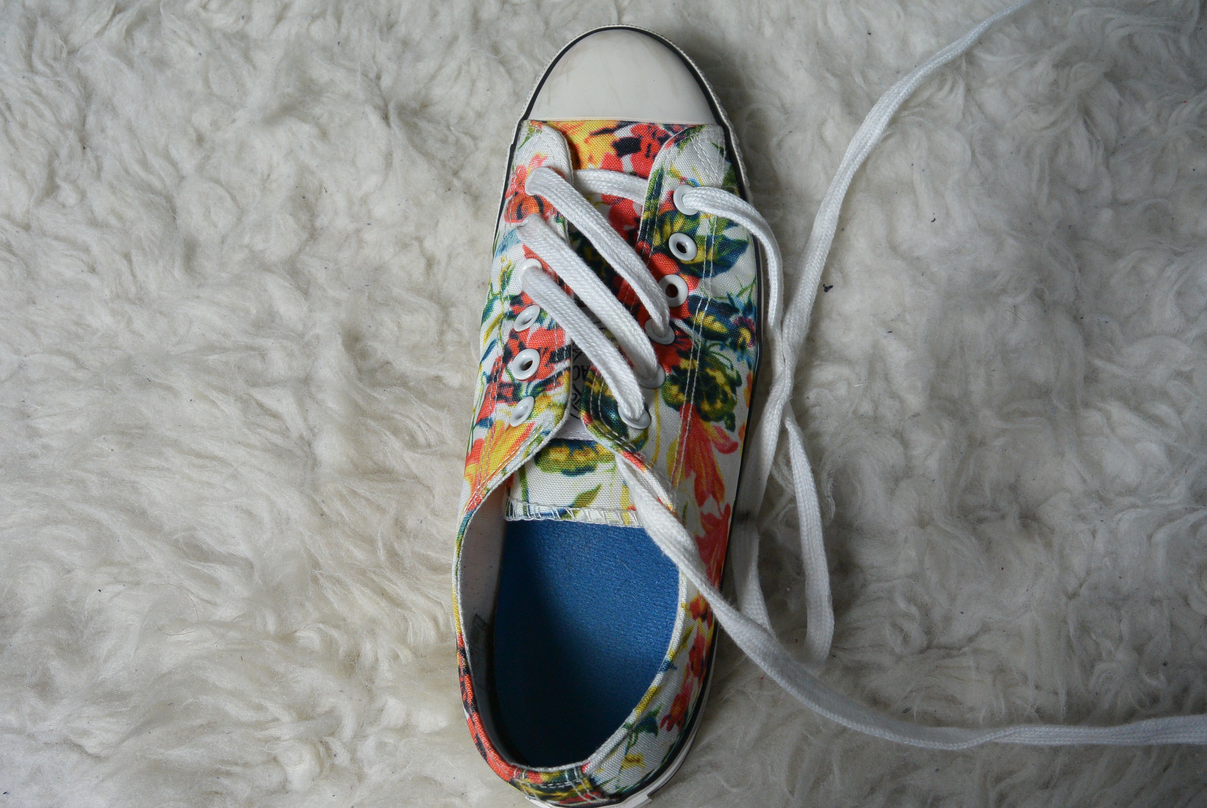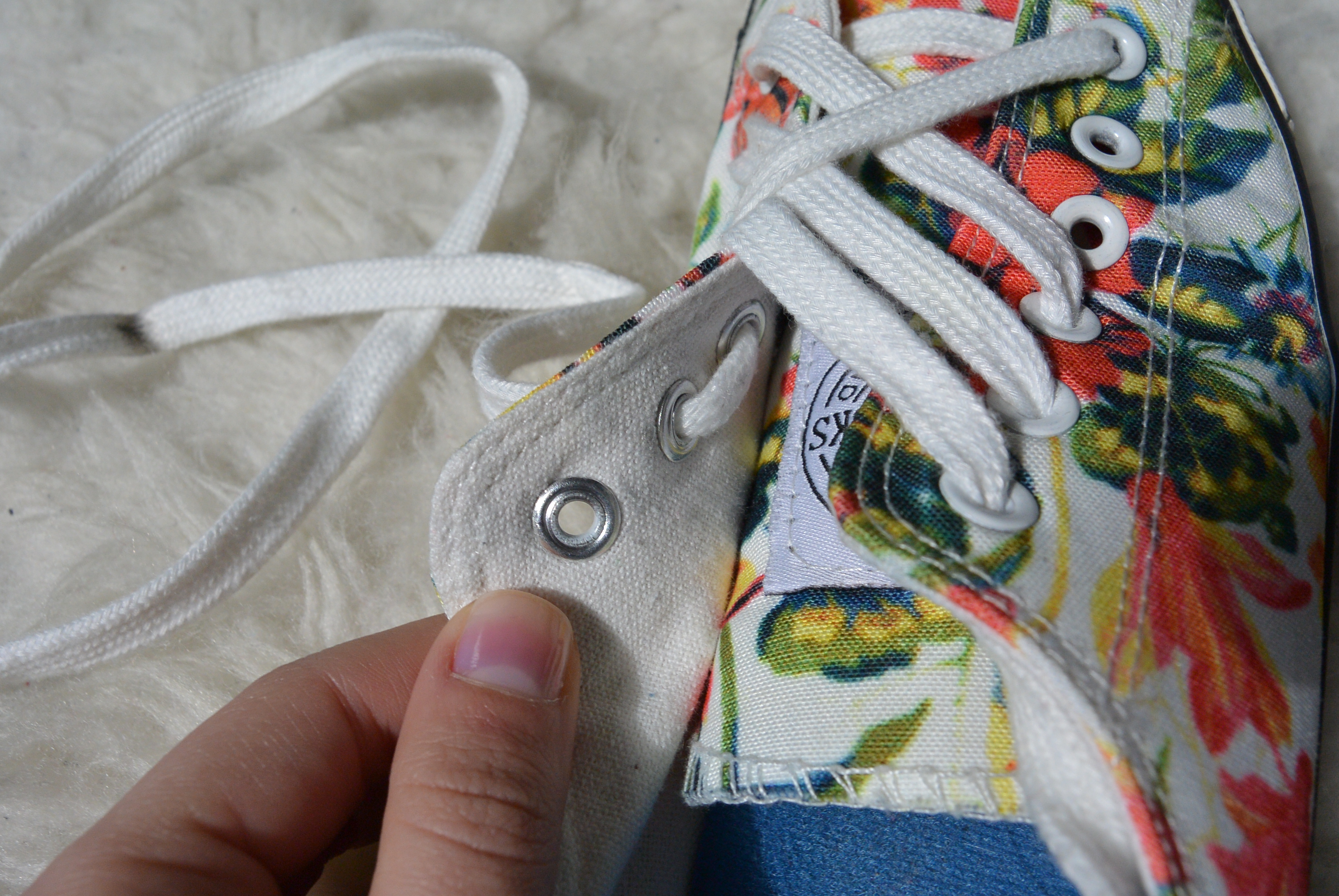 Stap 11: Doe de veter diagonaal en over het andere rijgwerk heen door het laatste oogje, en klaar! Je kunt je veters nu strikken en gaan! De instructies voor de linkerschoen werken precies omgekeerd. Hier begin je aan het rechter stuk veter en rijg je daarna het linker stuk.
