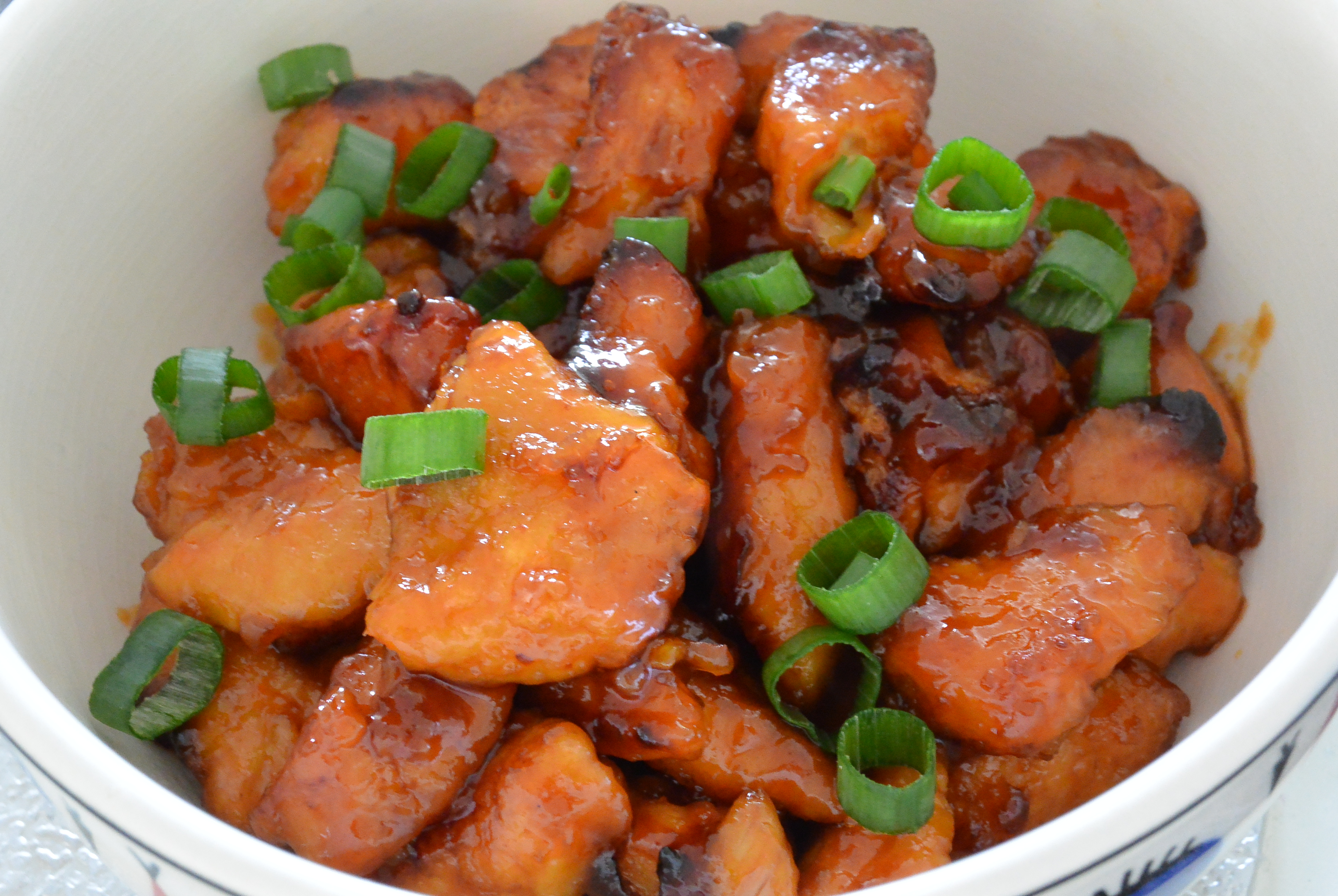 Schep de kip in een ovenschaal en giet de saus er overheen. Zet het geheel in de oven tot de saus dik en plakkerig is geworden. Check elk kwartier hoe de kip eruit ziet en roer het eventueel om. Als het goed is, moet de saus na 55 minuten gekarameliseerd zijn.