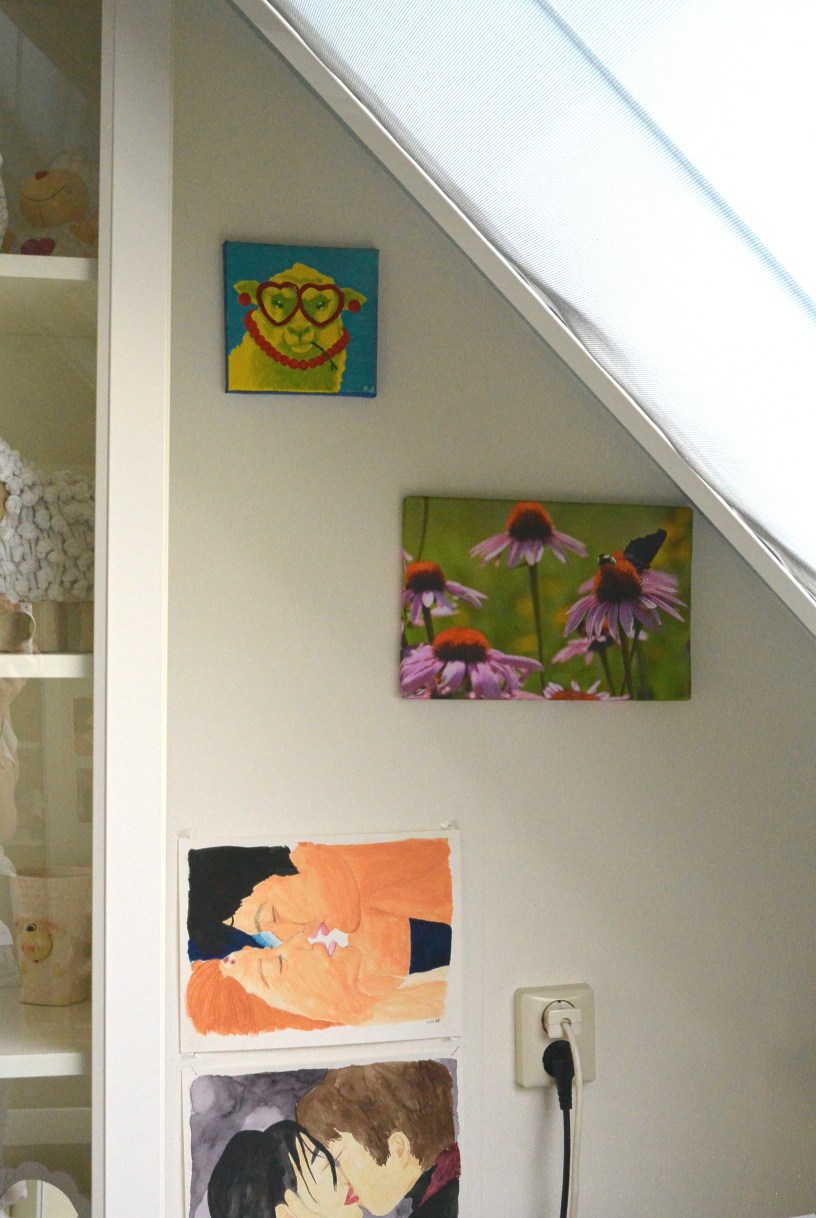Omdat ik op zolder slaap, heb ik weinig rechte muren. Gelukkig heb ik een leuk en knus plekje kunnen vinden voor deze bijzondere foto.