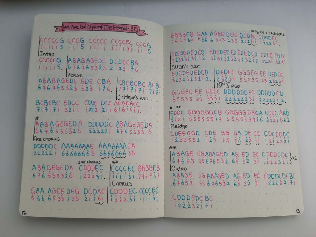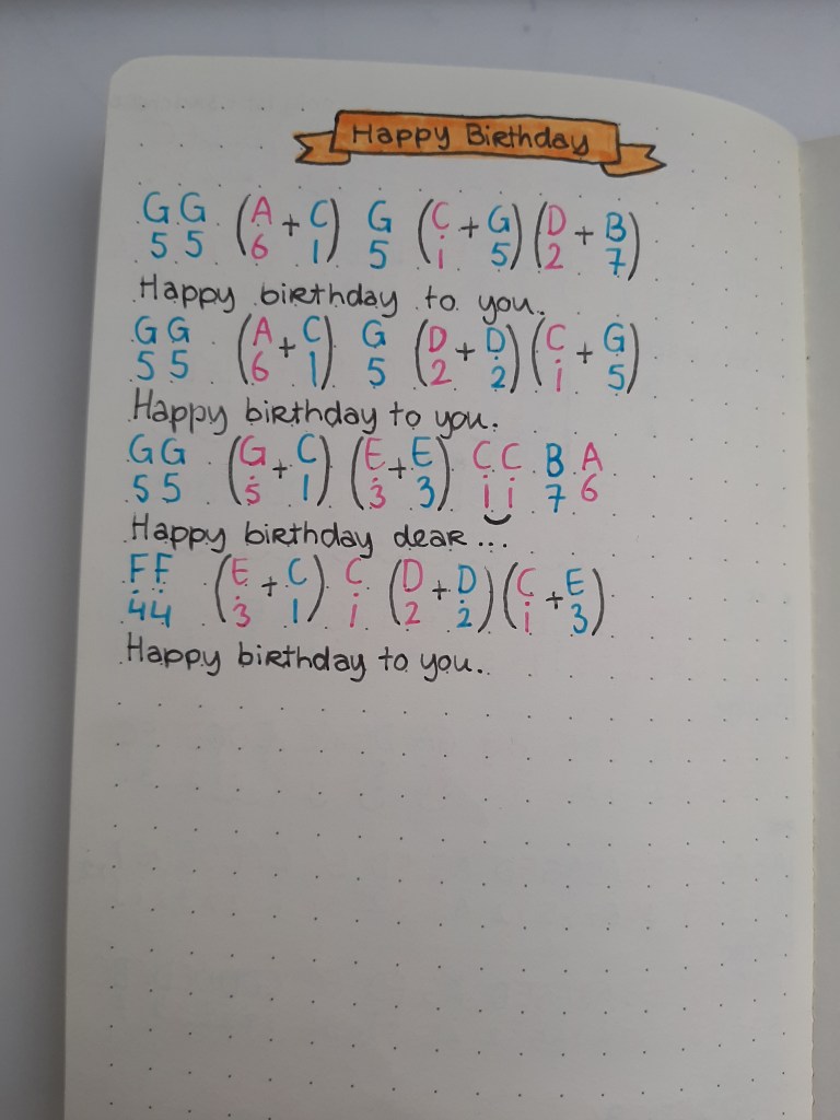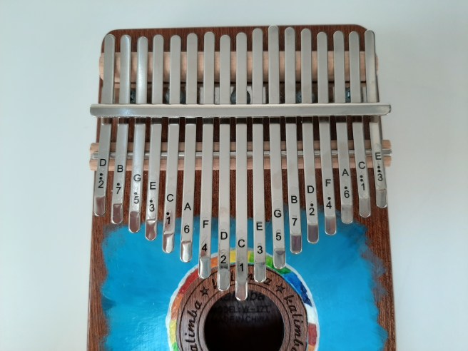 Wat mij persoonlijk heel erg heeft geholpen met het uitvinden van welke noot waar zit en met welke duim ik deze moet aanslaan, is een kleurenschema. Alle noten die ik met mijn linker duim moet aanslaan, noteer ik in het roze. Alle noten die ik met mijn rechter duim moet aanslaan, zijn blauw. Zo kun je tijdens het oefenen eerder zien welke noot zich waar bevindt. Dit heeft er bij mij voor gezorgd dat ik eerder de volgorde van de Kalimba tongen ken.