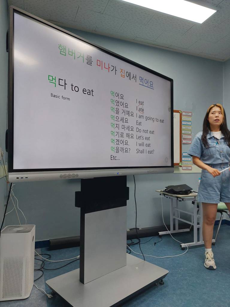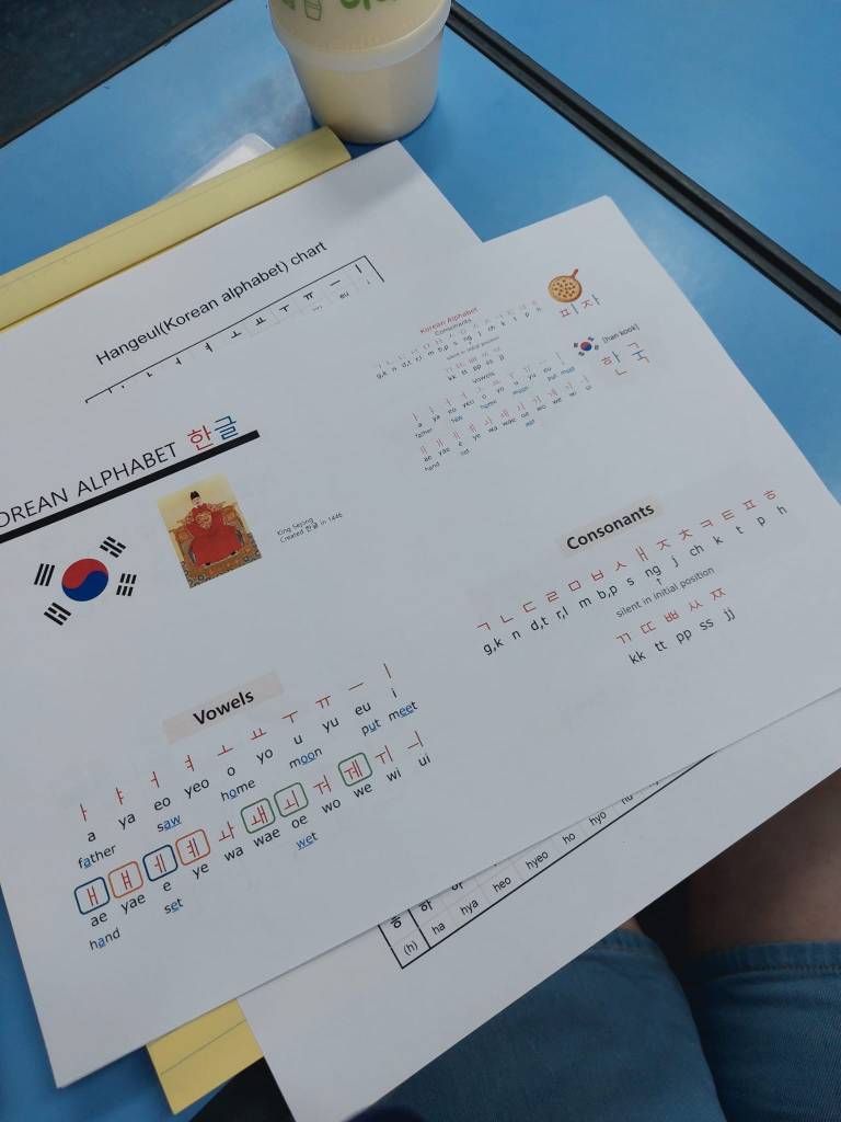 Het onthouden van de 62 verschillende namen is nog wel een dingetje. Gelukkig gebruiken ze tijdens de lessen allemaal een Engelse naam in plaats van hun echte Koreaanse naam. Nu vinden de kinderen mijn naam ook lastig om uit te spreken. In het Koreaans kennen ze namelijk geen rollende ‘R’ of uitgesproken ‘L’, maar gebruiken ze de letter ㄹ die er precies tussenin zit en een zachte uitspraak heeft. Dat maakt mijn naam dus nogal lastig.