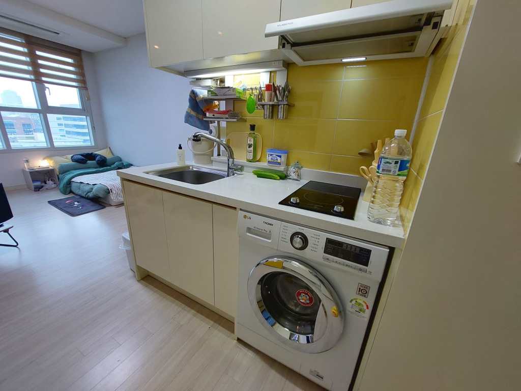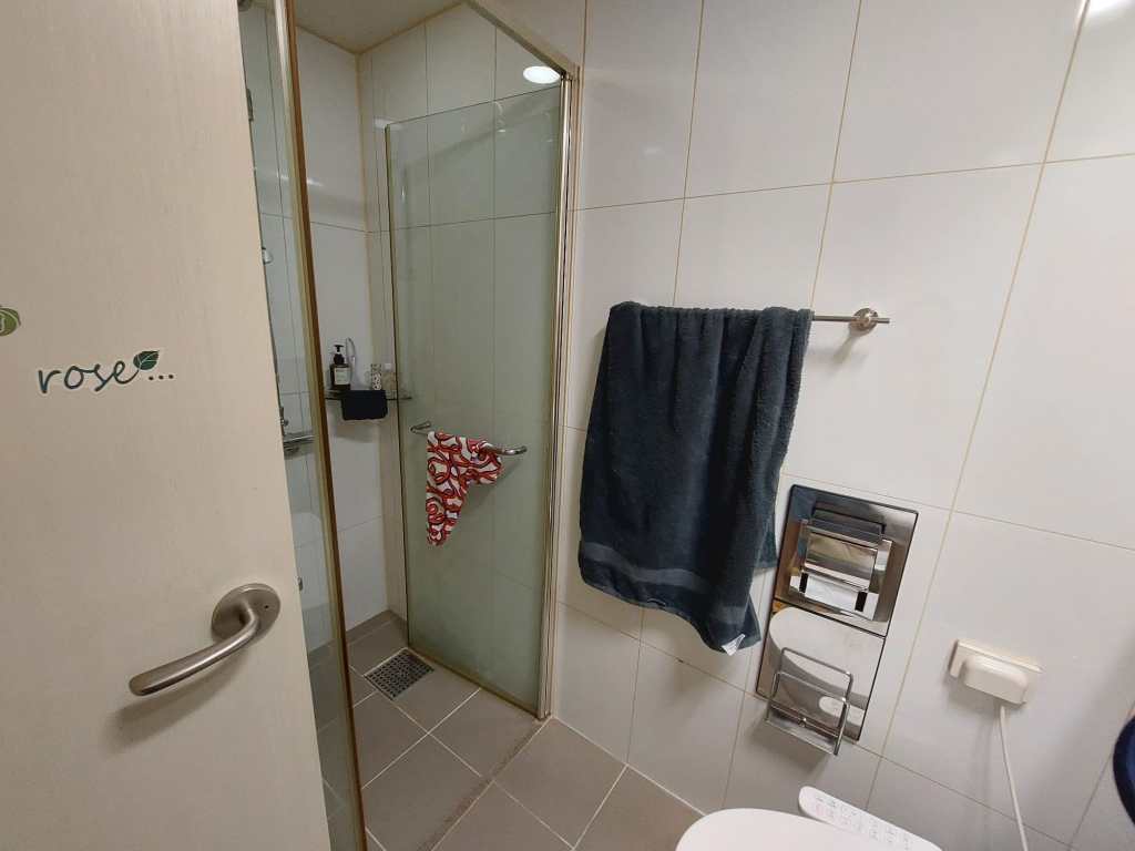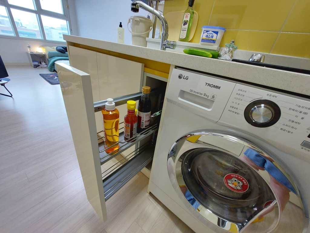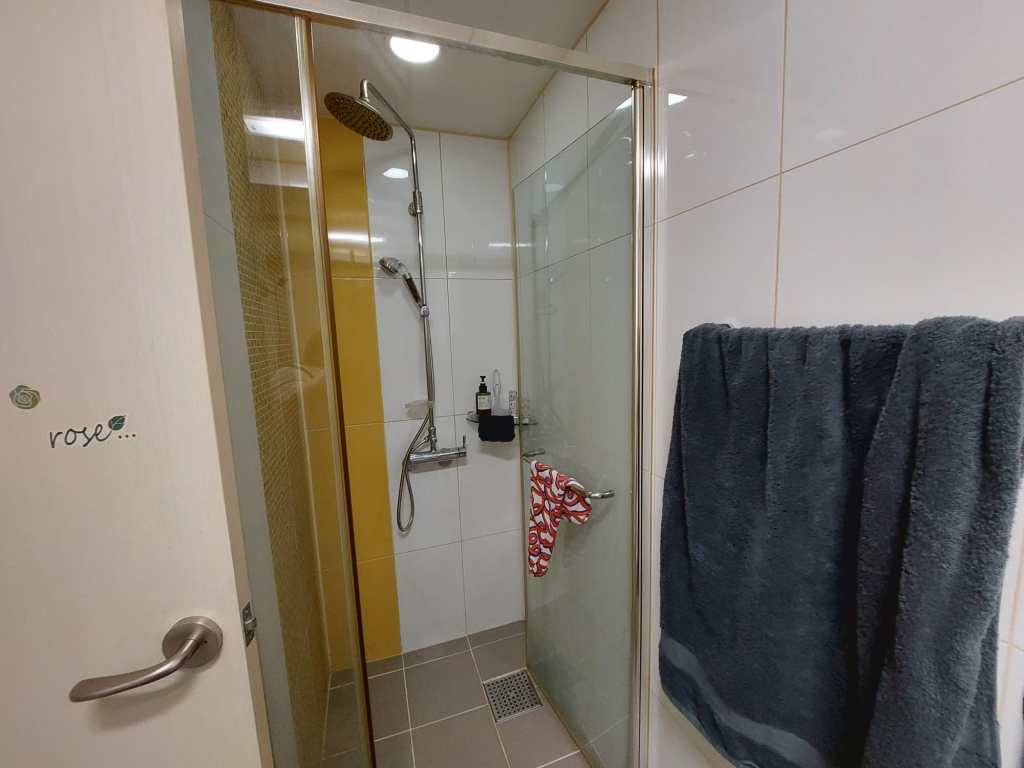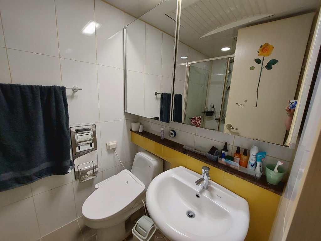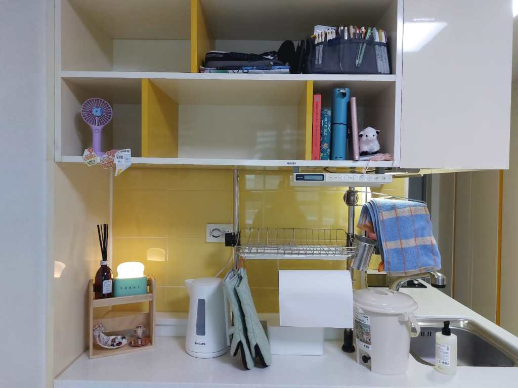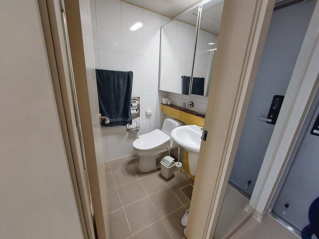 Mijn badkamer heeft twee ruime spiegelkasten met schuifdeuren, waar ik alles achter kwijt kan. Daarnaast ben ik super blij dat ik een afgesloten douchecabine heb. Dit komt namelijk lang niet altijd voor in Korea. Veelal zie je dat ze de douchkop boven de wastafel hebben hangen en wordt alles nat wanneer je probeert te douchen. Mijn toilet heeft een bidet (en ik wil nu niet meer zonder) en de badkamer zelf heeft ingebouwde afzuiging. De toiletrolhouder heeft zelfs een uitschuifbaar plankje waar je je telefoon op kunt leggen.