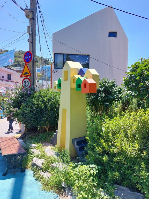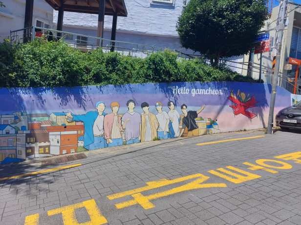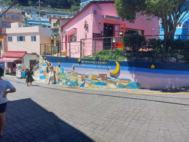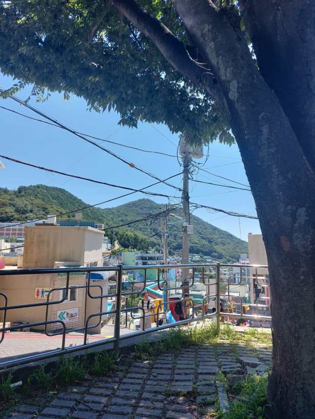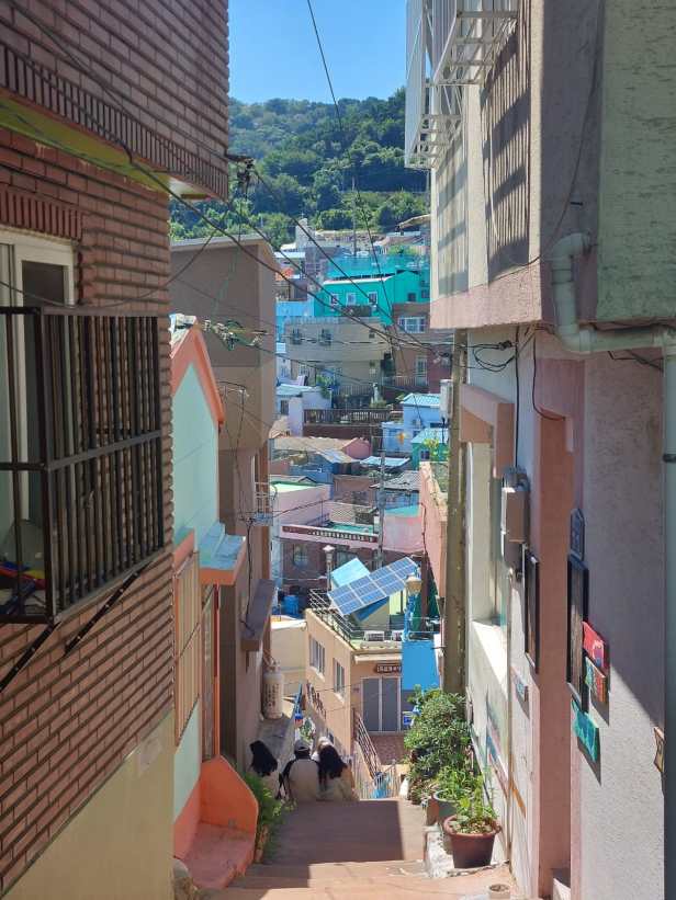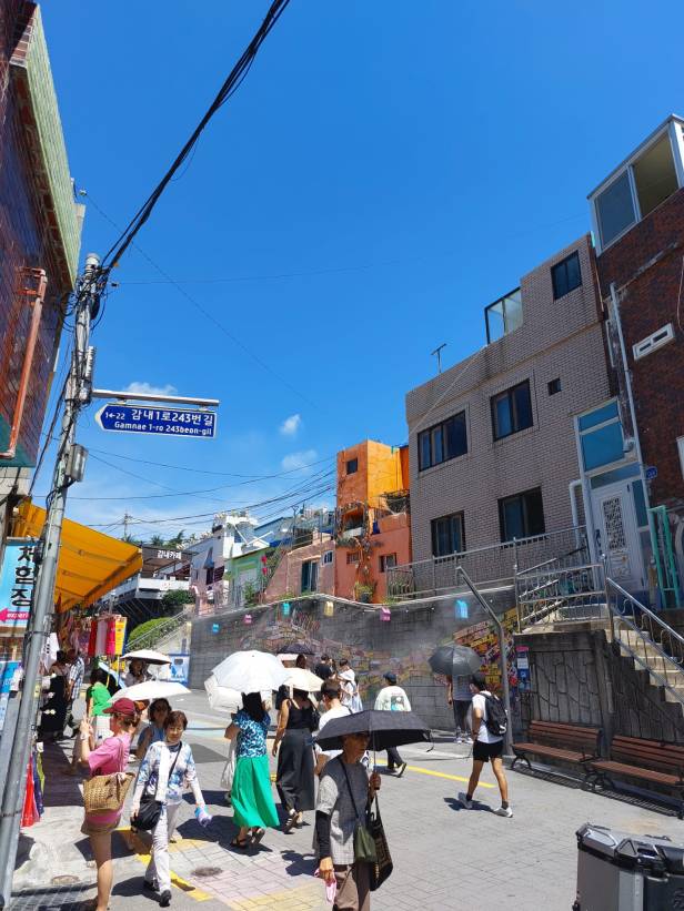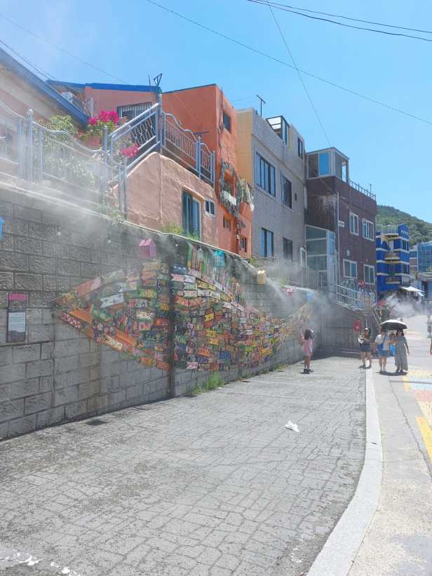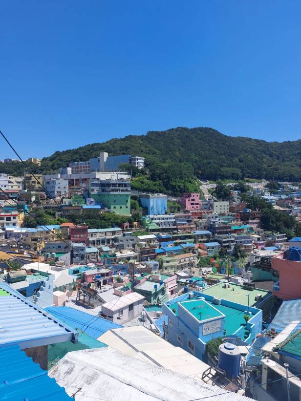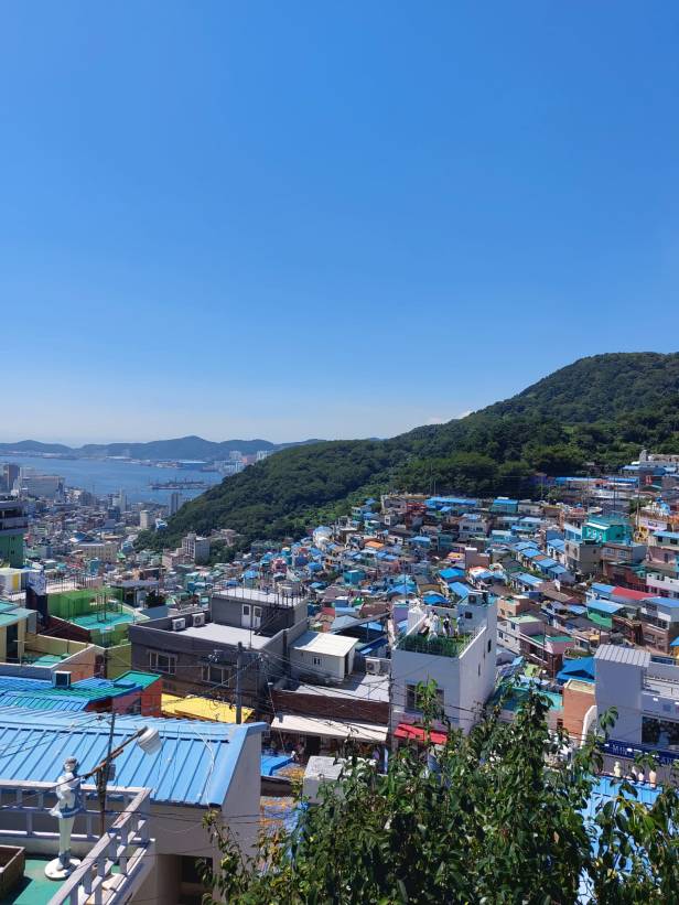 Op mijn laatste dag in Busan ben ik naar het populaire Gamcheon Culture Village gegaan. Dit is een gedeelte in de stad dat bekend staat om haar muurschilderingen, kunst en gekleurde huisjes. Het uitzicht was echt waanzinnig! En het was super leuk om door de verschillende kleine steegjes te slenteren. Het was heel erg warm buiten, maar ik had mijn UV-werende paraplu, UV-werende en verkoelende mouwen en mijn nek ventilator mee. Dit maakte het wat beter te doen.